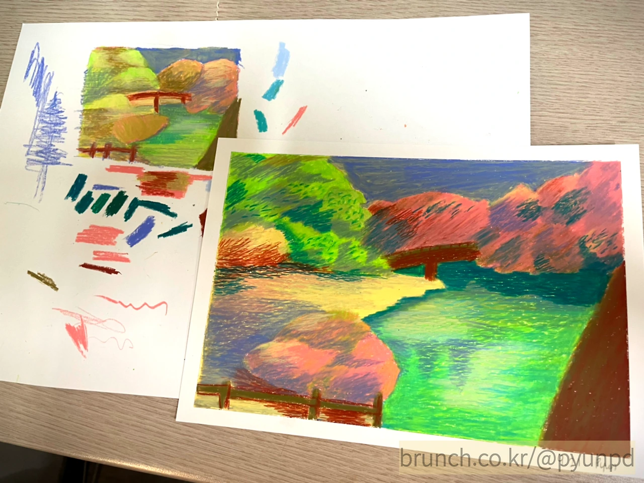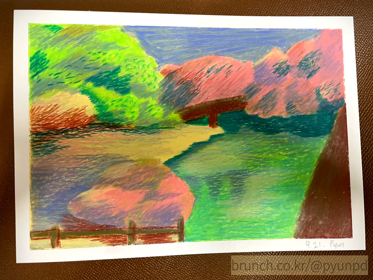 사진을 보면서 그리다 보니, 왠지 눈에 보이는 대로 한 치의 오차도 없이 '하늘은 파란색, 나무는 초록색으로' 그려야만 할 것 같은 강박이 쉽게 놓아지질 않았다. 그래서 색감을 아예 다르게 칠해야 할 때가 가장 망설여졌다. 쉽게 말해, 파란 강물을 초록색이나 핑크톤으로 칠하는 걸 상상조차 못 하는 거였다. 강사님은 이 부분을 수강생들이 가장 어려워한다고 하셨다. (아 나만 쓸데없이 고지식한 거 아니었구나...)