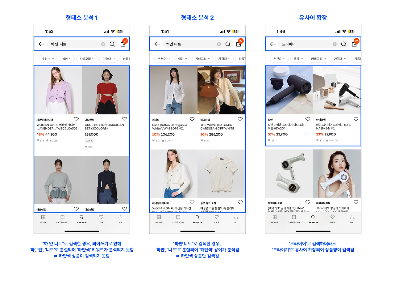 예를 들어 '드라이어'와 '드라이기'는 둘 중 하나만 검색해도 다른 용어가 포함된 상품이 함께 검색되고 있어 유사어로 관리됨을 알 수 있습니다. '흰 니트'와 '하얀 니트'를 검색한 결과 또한 일부 정렬 순위만 다를 뿐 비슷해 마찬가지의 케이스에 해당합니다.
