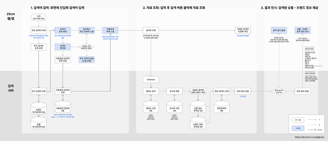 검색 서비스 전반의 플로우를 정리해 보았습니다. 마찬가지로 3단계로 나누어 사용자의 행동이 발생했을 때, 기능과 정보를 처리하는 과정에서 발생 가능한 여러 시나리오를 테스트해보며 로직을 분석했습니다.