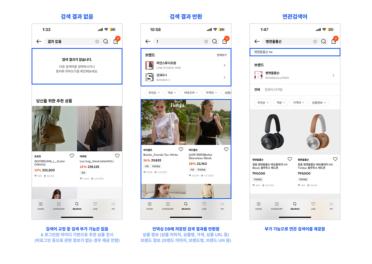 상품이나 브랜드의 정보가 담긴 원천 DB는 별도로 존재하지만 수많은 데이터가 저장된 만큼 매 검색마다 직접 조회하면 검색 성능이 낮고 부하가 우려될 수 있습니다. 따라서 주요 정보만 별도로 저장한 인덱싱 DB를 따로 관리해 검색 시에만 활용하며, 정기적으로 업데이트해 최신성을 유지할 것입니다. 인덱싱 DB에 저장된 데이터의 종류를 알고 싶다면 검색 결과 목록에 제공하는 정보를 확인하면 됩니다.