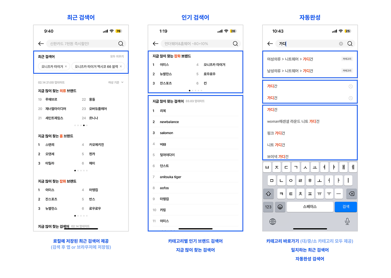 검색 입력필드를 선택할 때, 저장된 최근 검색어가 있는 경우 제공됩니다.