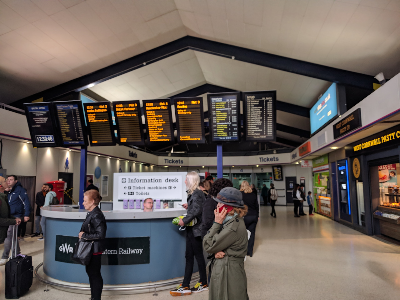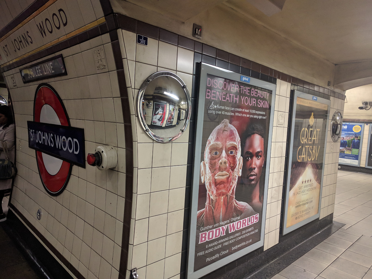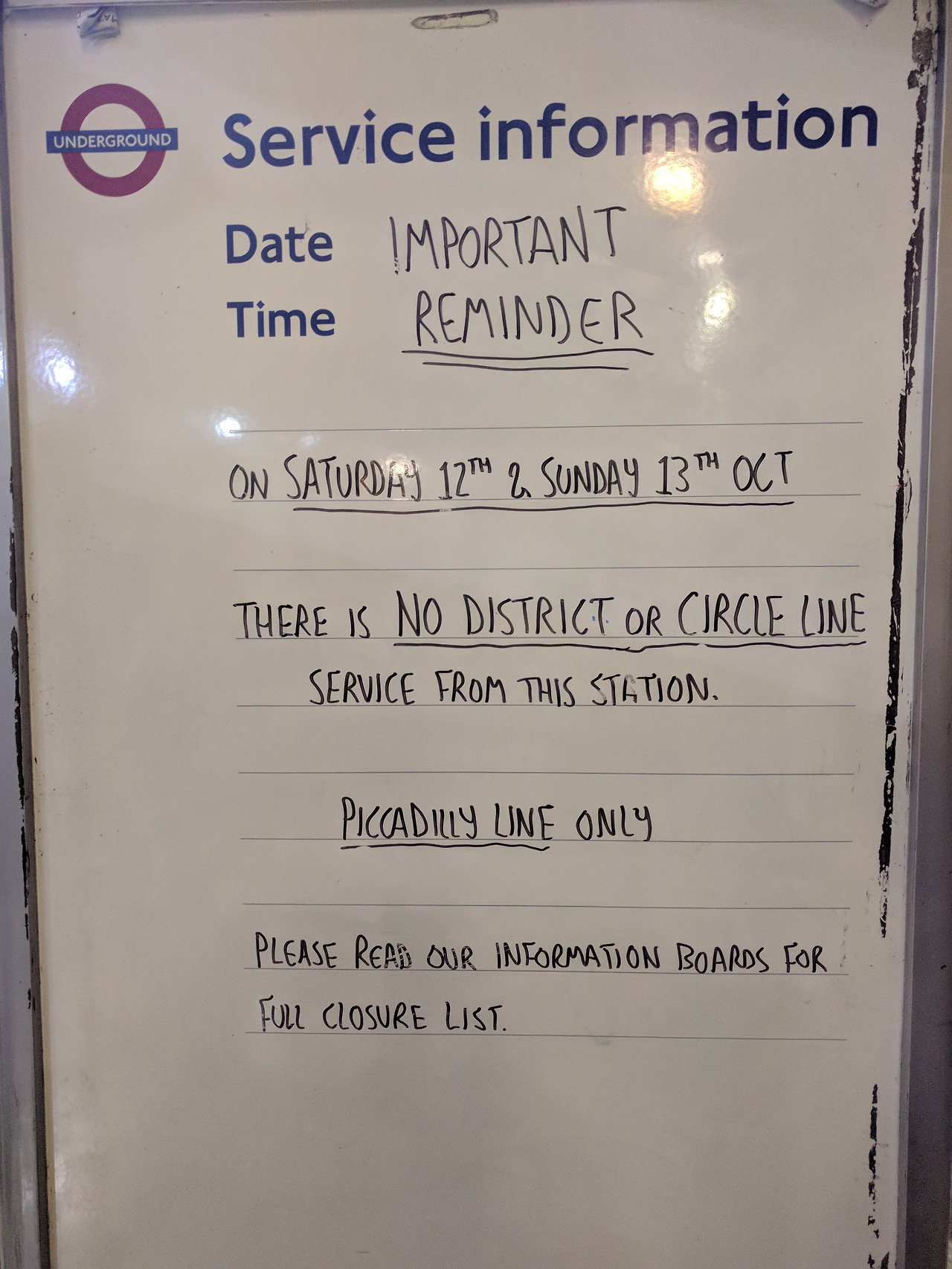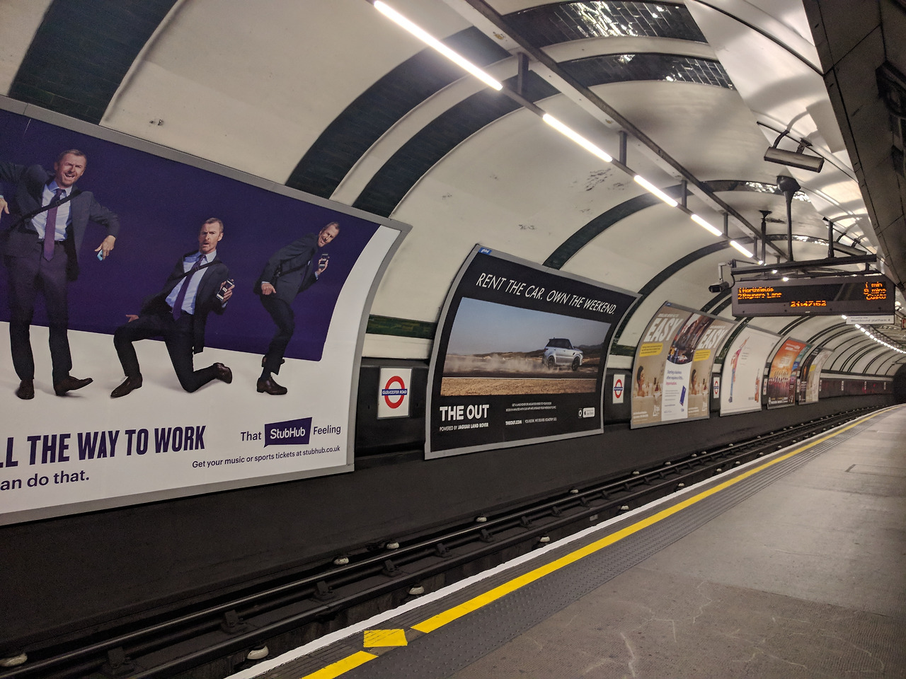 전동차는 그리 커 보이지 않았지만 역 내부는 크고 넓어 보였다. 왜 그렇게 느꼈냐며 광고판이 무척 컸다. 이베이 소속인 티켓 판매 서비스인 스텁허브 광고를 봤는데 거대했다. 뮤지컬의 고장이다 보니 뮤지컬 광고도 엄청 컸다. 그때는 라이온 킹과 알라딘 뮤지컬을 하고 있었다. 여기는 화이트보드에 중요한 공지사항이나 노랫말 퀴즈를 끼적이곤 했다(종이로 프린트해서 공지사항을 붙이기도). 우리가 런던을 떠나던 날에는 얼스코트 역에 서클 라인으로 향하는 지하철을 탈 수 없었다. 여기는 피카딜리 라인과 서클 라인 환승역이었다.