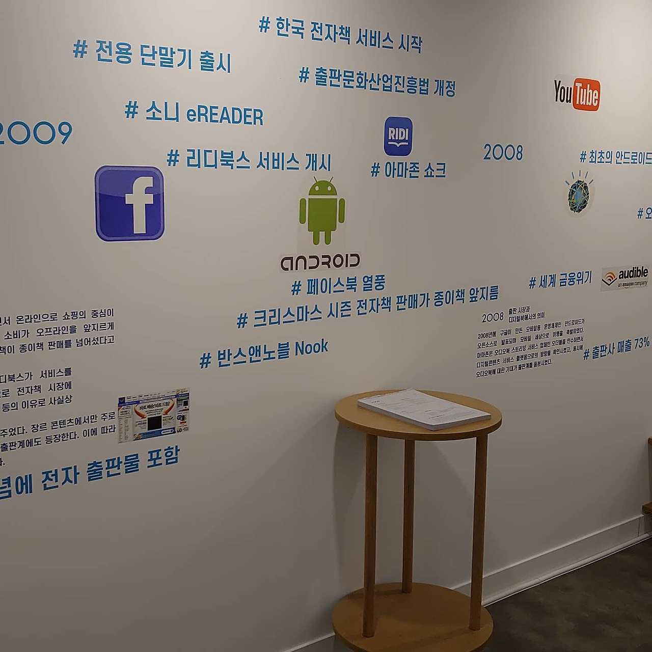 내가 이 전시가 정말 좋았던 이유는- 첫째, 공부가 많이 됐기 때문이다. 앞서 언급했듯 디지털 출판 13년 역사를 다루면서 한해도 빠뜨리지 않고 그해 출판업과 관련해서 어떤 이슈가 있었는지 일목요연하게 담았다. 아이폰이 나온 2007년이 출판업계에서도 기념비적 해였음을 이 전시에서 배웠다. 또 전시 정보가 과다하지 않고 필요한 주제어만 표시해도 그해가 어떤 특징이 있는지 알 수 있어 좋았다. 장문 설명도 있긴 한데 적당한 분량이다. 핵심만 잘 짚어내서 설명글 쓰신 분. 누구신지 모르겠지만 너무 잘하신 것 같다. 배우고 싶네요.