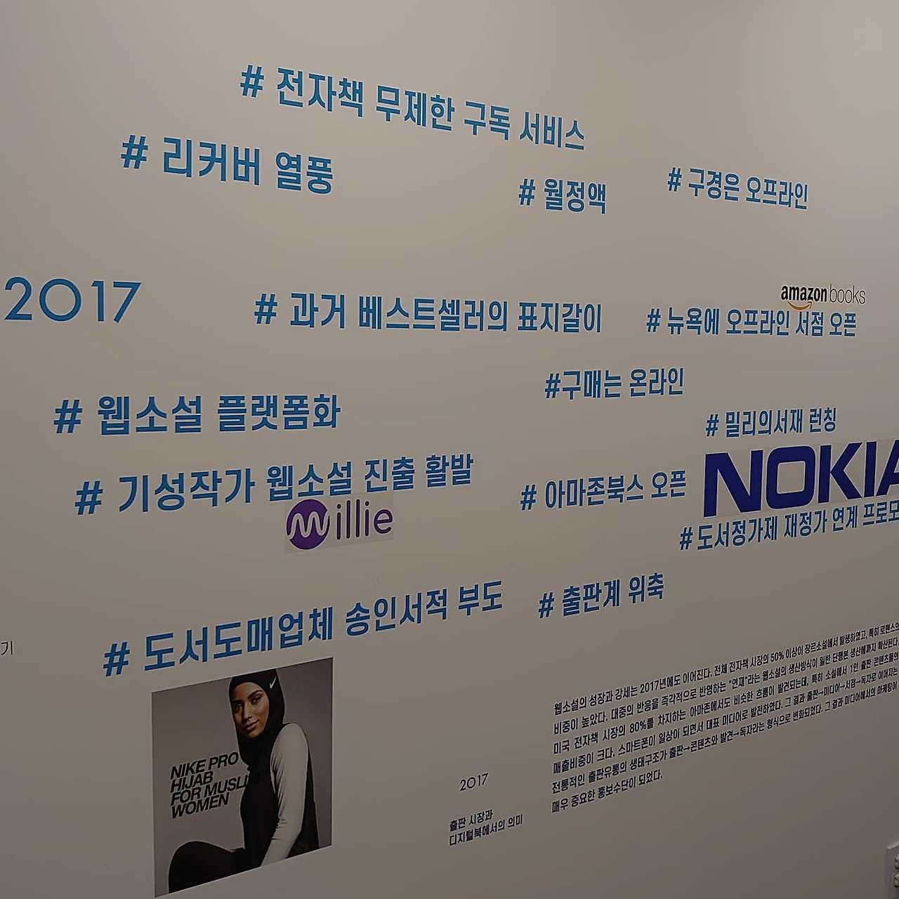내가 가장 좋았던 건 디지털 북페어 전시였다. 이전에도 도서전에서 디지털 책 관련 전시를 안 한 건 아니었는데. 올해는 특히 좋았다. 디지털 출판 역사 13년을 개관했다. 연도별로 주요 이슈를 해시태그로 달아서 벽이나 책상에 활자로 썼다. 관련된 내용을 종이로도 인쇄했는데 한 장씩 북 찢어갈 수 있었다. 그걸 모아 묶어서 책도 만들 수 있고. 연도별로 킨들이나 아이폰 같은 기념비적인 단말기, 시각장애인을 위한 점자 기기, '채식주의자'나 '정의란 무엇인가'처럼 그해 화제가 된 책도 함께 비치했다. 오디오북, 증강현실 책 코너도 있고.