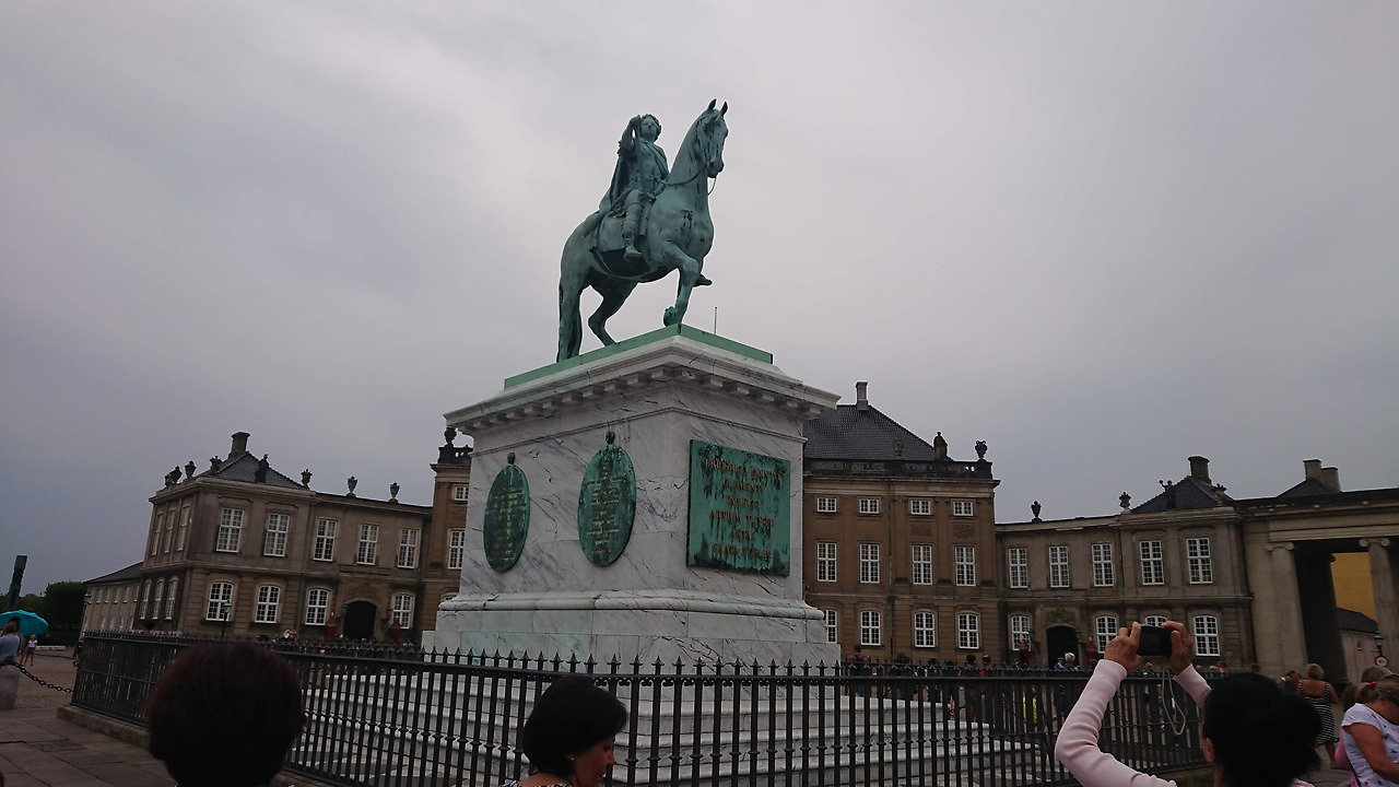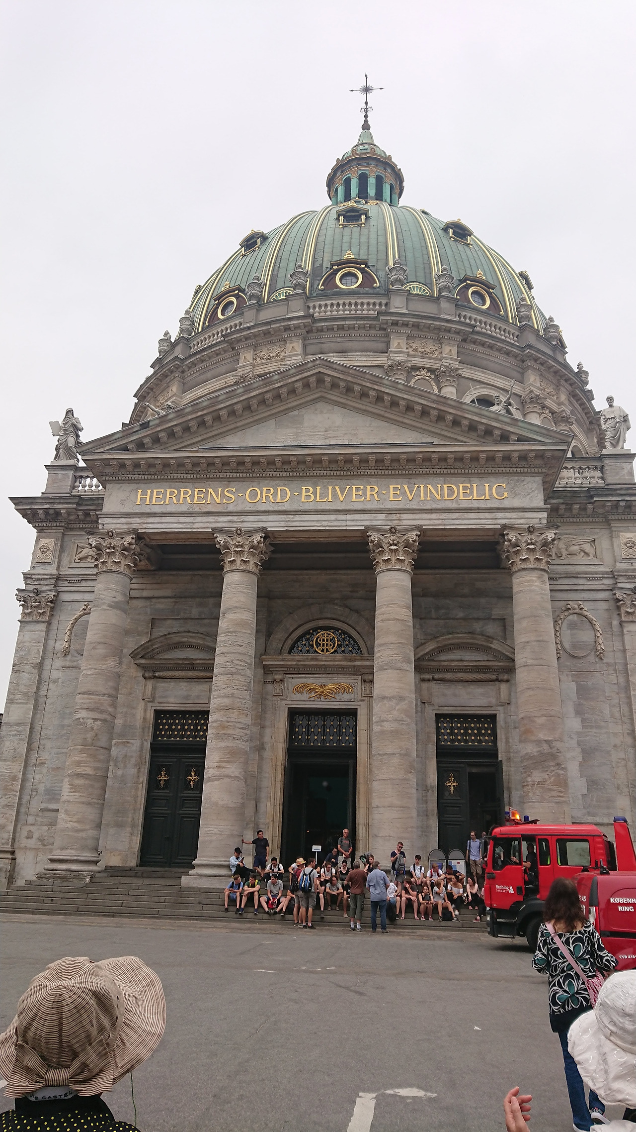 이어서 아말리엔 보르 성과 프레데릭 교회에 갔다. 이날 오후에 오슬로로 가는 DFDS 배를 타야 해서 시간이 많지 않았다. 헬싱키 여행할 때와 비슷한 듯. 노르웨이 빼고는 대체로 여행이 그런 식이었다. 아말리엔 보르성은 덴마크 왕실에서 겨울에 전용으로 쓰는 궁전이라고 한다. 주 건물은 4개. 밖에서만 건물을 구경하고 가운데 동상만 사진 찍었다. 이때 비가 흩뿌렸는데 동상 주변에 철퍼덕 앉아 있는 관광객이 많았던 것 같다. 동상 주인공은 프레드릭 5세. 궁에서 좀만 걸어가면 프레데릭 교회가 있다. 큰 돔이 특징인 대리석 교회.