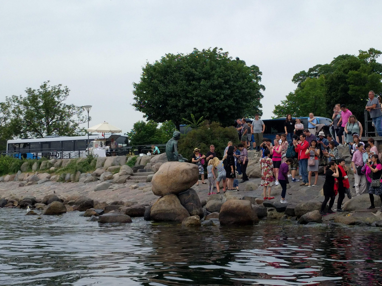 나도 인어공주 동상을 배경으로 사진 찍고 싶은데 비도 오고 사람들도 많아서 촬영 환경이 편치 않았다. 어떤 관광객이 우산을 쓰고 쪼그리고 앉아서 인어공주 동상과 셀카를 찍는 게 보였다. 그에게 내 사진도 찍어달라고 부탁했다. 세 번 정도 사진을 찍어주던데 찍을 때마다 썩 마뜩지 않아하는 표정이었다. 사진을 잘 못 찍어서라기보다 모델이 문제가 아닐까 싶다만. 굳이 그 사람에게 사진을 찍어달라고 부탁한 이유는 남자인데다 외모가 괜찮아서 말 걸어보고 싶었다. 흡.