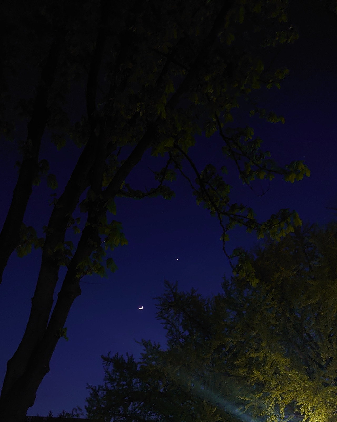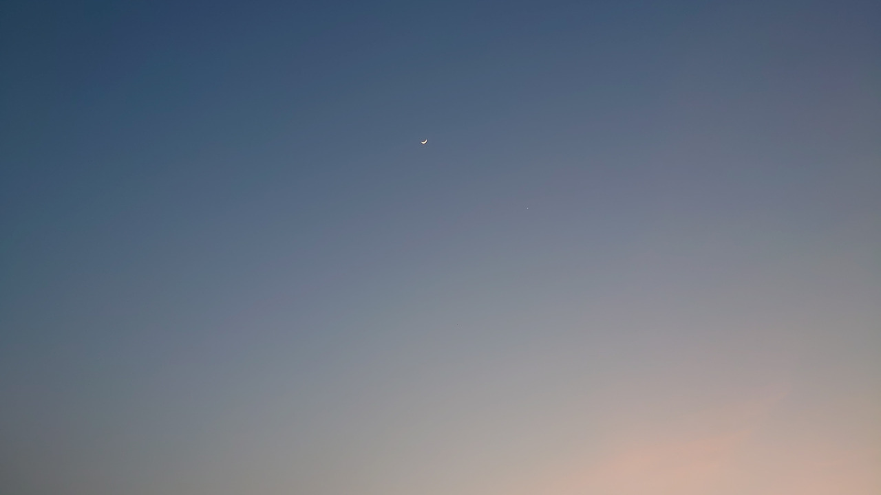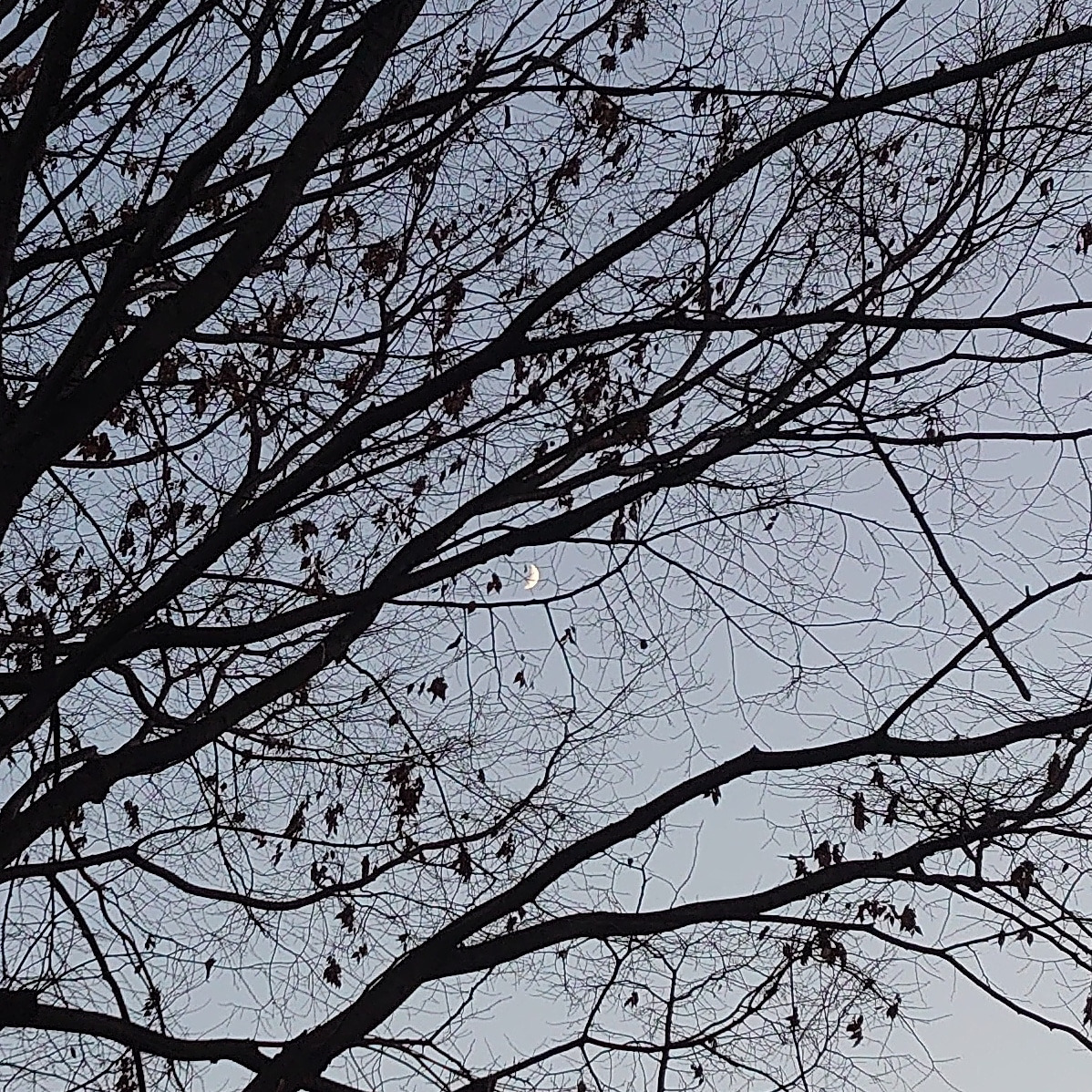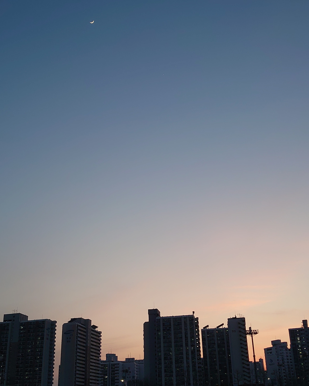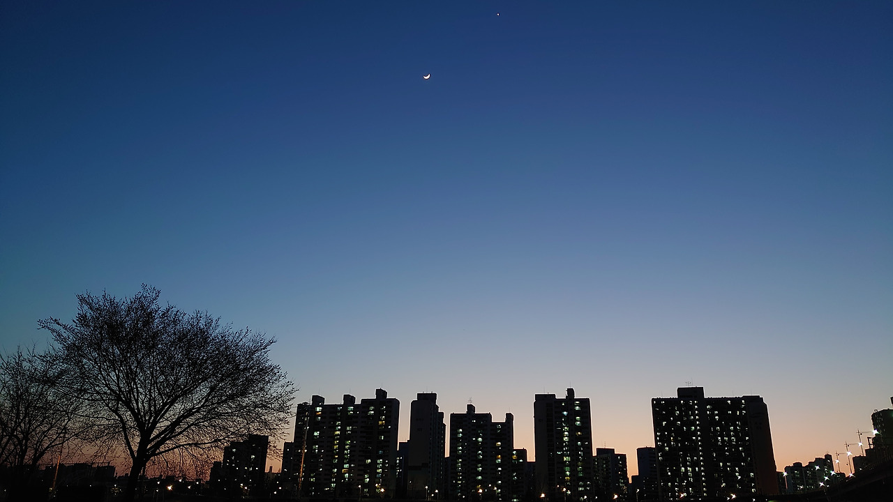 몇 주 전에는 주말 늦은 오후 산책을 나섰다가 이 문단 아래에 있는 사진에 나온 달을 봤다. 마치 나뭇가지에 달이 걸린 느낌도 들었다. 까만 하늘, 밝은 달 통념을 깬 듯한 모습이 마음에 들었다. 사진을 여러 장 찍어서 저 사진을 건졌다. 초승달, 반달, 보름달 등 종류가 다양한데 아무래도 초승달이 예쁘다. 특히 눈썹달일 때. 너무 크고 둥글면 과한 느낌이 든다. 수퍼문을 볼 때는 달이 부담스러울 정도로 너무 크다 싶었다. 너무 위풍당당. 초승달은 크기가 적당해서 보기 덜 부담스럽다. 이를 배경 삼아 사진 찍으면 아기자기한 멋도 있고.