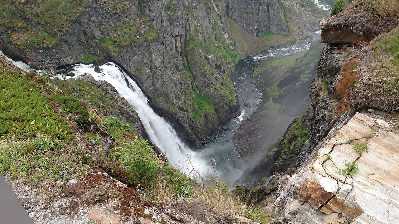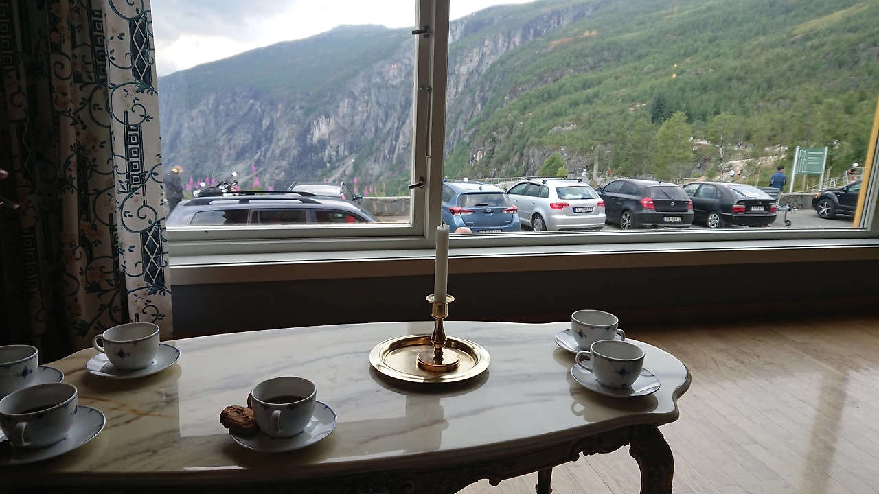 역사가 있는 호텔이라서 그런지 고풍스러운 느낌도 들고 인테리어도 마음에 들었다. 곳곳에 비치된 소품(?)도. 피아노 외에도 옛날에 쓰던 물건이 기념으로 전시돼 있었다. 여력이 되면 한번 묵고 싶다는 생각이 드는 곳이었다. 역사적으로 의미 있는 장소이기도 하지만 뵈링폭포가 바로 옆에 있으니. 뵈링폭포는 높이가 182m에 달한다. 폭포수가 천둥처럼 쏟아져 내려가기 때문에 노르웨이에서 가장 잘 알려져 있다고 한다. 폭포 아래에는 모뵈달렌협곡이 있고. 폭포 아래를 내려다보면 정말 아찔하다.