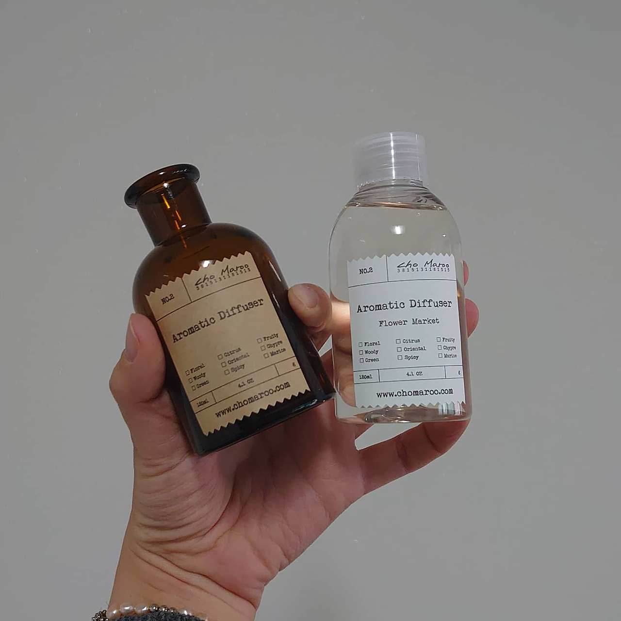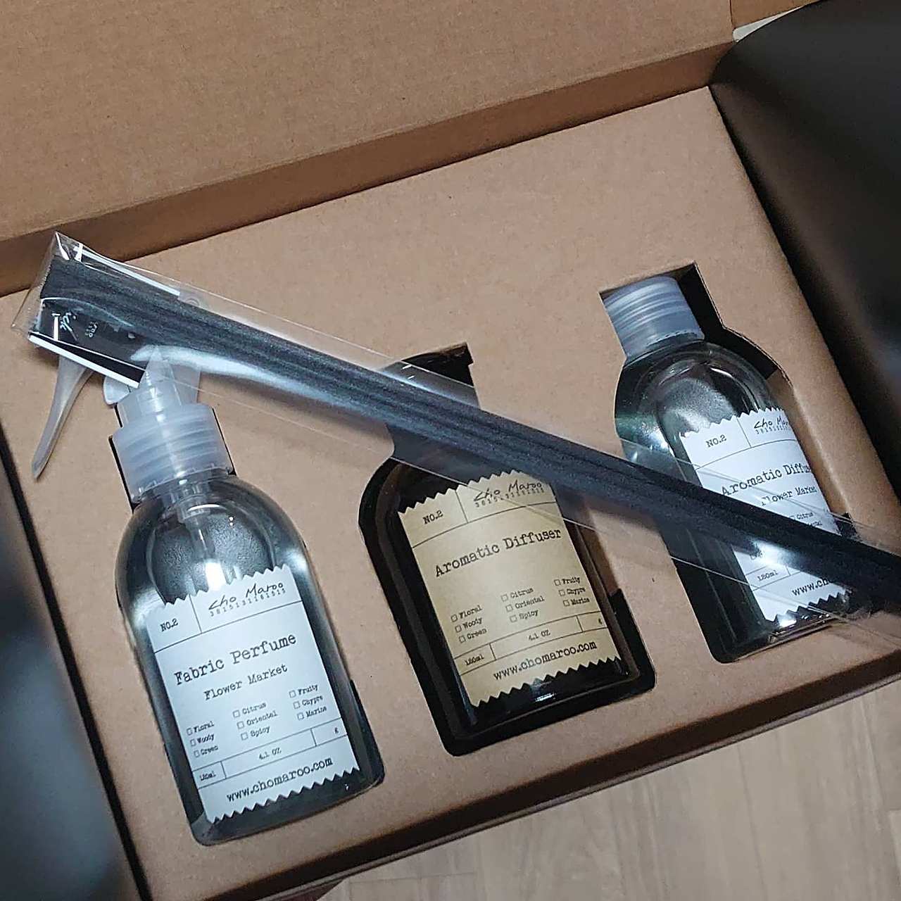 사진 1번 거베라와 초마루 디퓨저, 홀가, 2번과 5번 카네이션과 안개꽃, 3번 소프라노 장미, 4번 리시안셔스와 미니 과꽃, 거베라, 6~7번 초마루 디퓨저 세트. 사진=딱정벌레