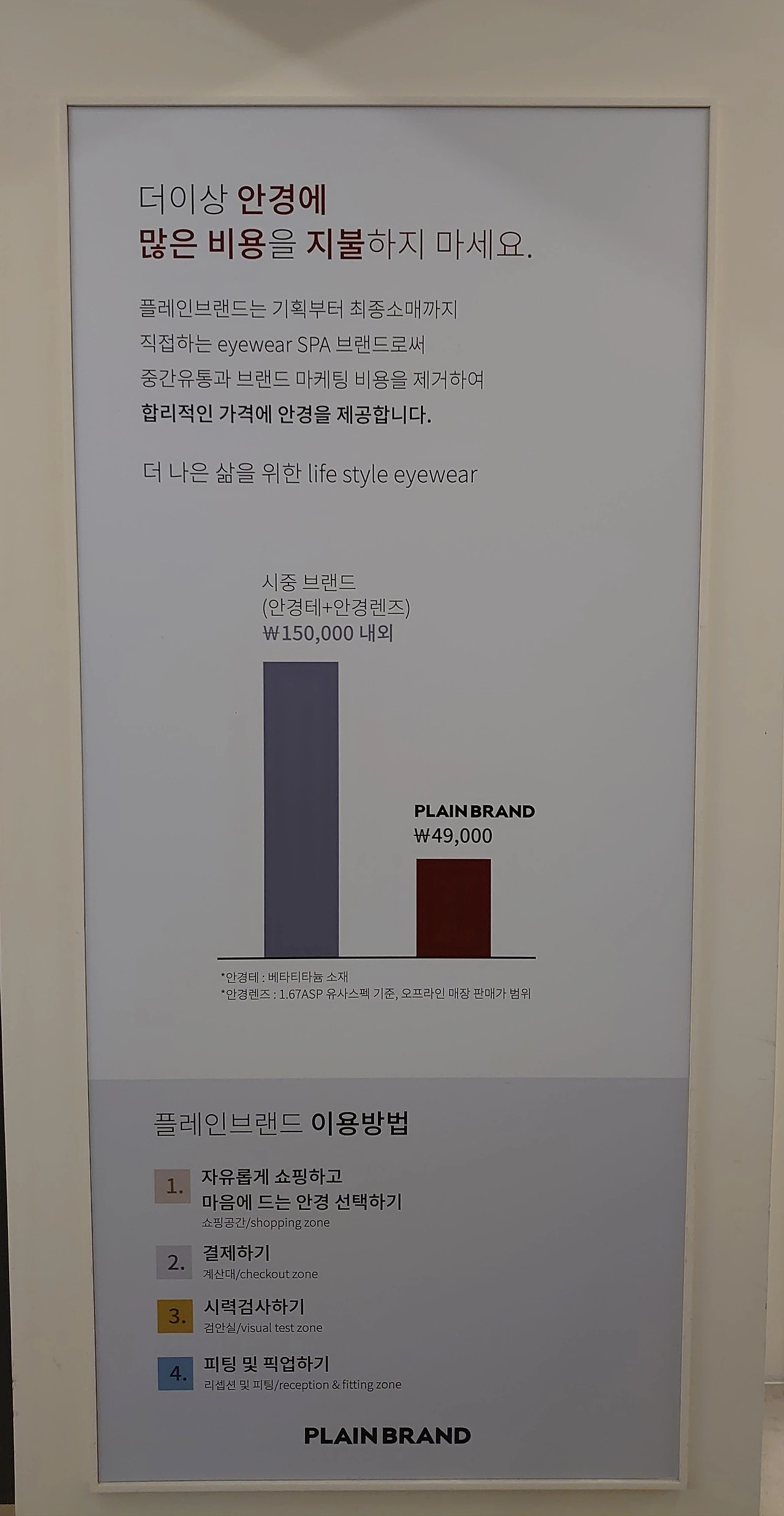 플레인 브랜드에 끌린 이유는 온오프라인을 연계했다는 점에서 와비 파커가 생각나고, 안경 맞추는 비용이 몹시 저렴하기 때문이다. 앞서 말했듯 블루라이트 차단 렌즈를 제외하면 안경테 가격에 렌즈 가격이 포함돼 있다. 안경테 가격=안경테+렌즈 가격. 가격대는 2만4900~4만9000원. 블루라이트 차단 렌즈로 맞추려면 1만4900원인가 더 내야 한다. 이 브랜드는 29cm에도 입점해있다. 오프라인 매장은 넓고 따라다니는 점원이 없어서 둘러보기 편했다. 안경 케이스나 렌즈 닦는 수건은 따로 사야 한다. 케이스는 3900원, 수건은 2000원.