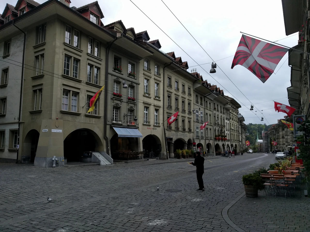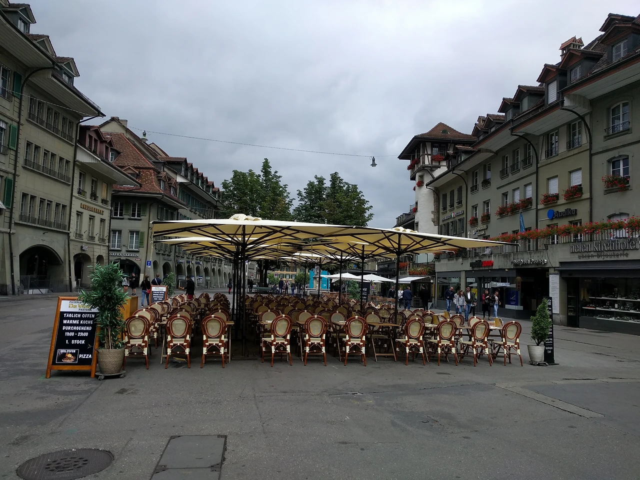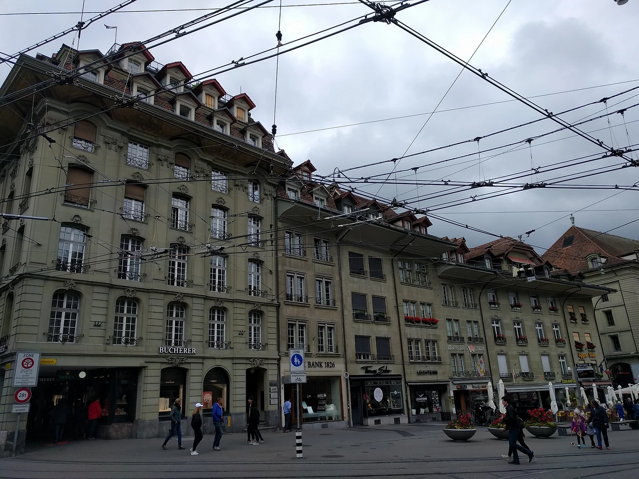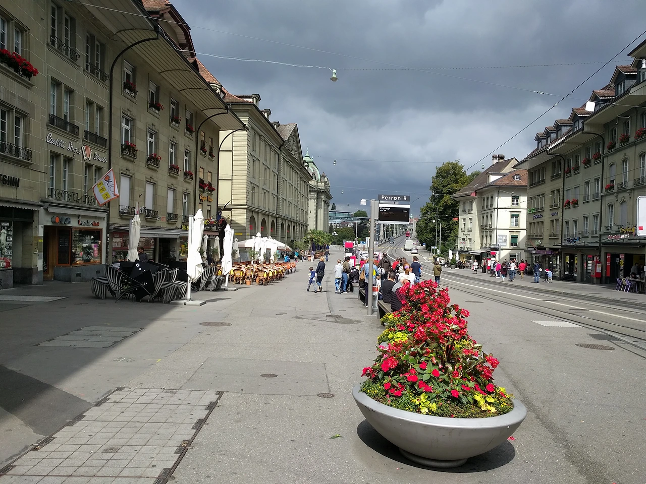 베른에서는 도보로 아레강을 보고 마르크트 광장을 지나며 시계탑, 베른 연방 궁전을 구경했다. 베른 대성당, 아인슈타인 하우스도 가다가 보고. 그날은 일요일이라서 문 닫은 상점이 많았다. 원래 인구가 적은 지, 도시가 커서 그런지 번화가에 왔는데도 무척 조용하고 한적했다. 물론 관광객은 많았다. 사진을 다시 보니 심심한 그 풍경도 멋졌다 싶지만. 베른 연방 궁전 근처에서 아래를 내려다보니 마을 풍경도 괜찮았다. 동화책이 나오는 집 같다고 해야 하나. 길가에 트램이 다니는 풍경도 운치 있었고. 아직 문 열지 않은 노천카페도 멋스러웠다.