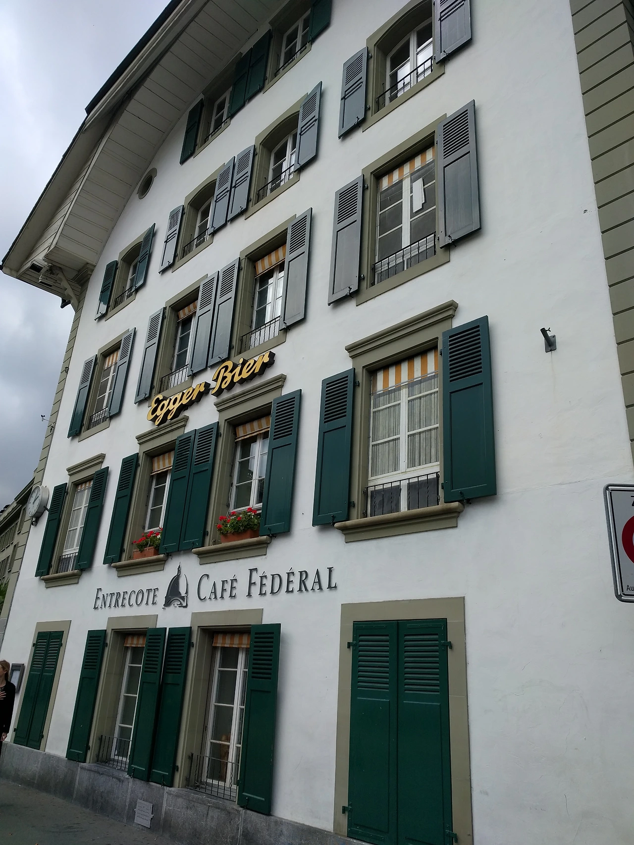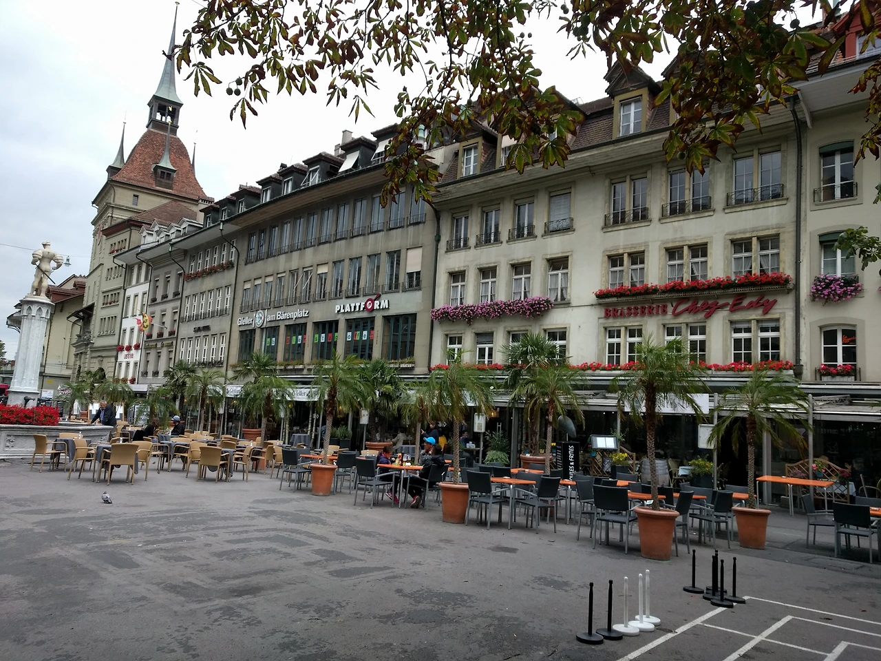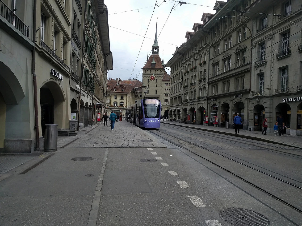 베른에서는 도보로 아레강을 보고 마르크트 광장을 지나며 시계탑, 베른 연방 궁전을 구경했다. 베른 대성당, 아인슈타인 하우스도 가다가 보고. 그날은 일요일이라서 문 닫은 상점이 많았다. 원래 인구가 적은 지, 도시가 커서 그런지 번화가에 왔는데도 무척 조용하고 한적했다. 물론 관광객은 많았다. 사진을 다시 보니 심심한 그 풍경도 멋졌다 싶지만. 베른 연방 궁전 근처에서 아래를 내려다보니 마을 풍경도 괜찮았다. 동화책이 나오는 집 같다고 해야 하나. 길가에 트램이 다니는 풍경도 운치 있었고. 아직 문 열지 않은 노천카페도 멋스러웠다.