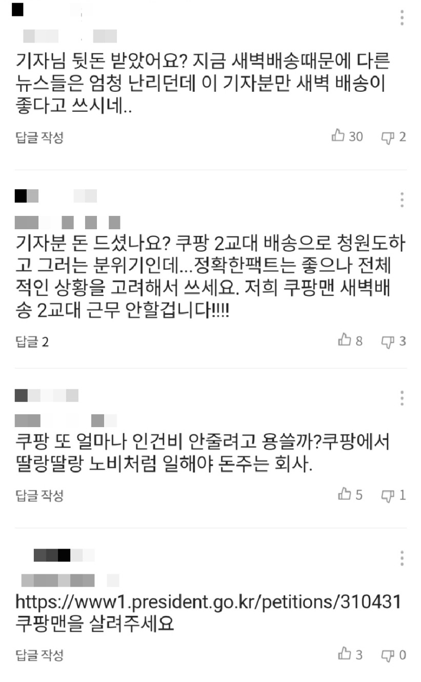 그 기사에는 비난 댓글이 10개 넘게 달렸다. "기자님 뒷돈 받았어요? 지금 새벽 배송 때문에 다른 뉴스들은 엄청 난리던데 이 기자 분만 새벽 배송이 좋다고 쓰시네", "기자분 돈 드셨나요? 쿠팡 2교대 배송으로 청원도 하고 그러는 분위기인데... 정확한 팩트는 좋으나 전체적인 상황을 고려해서 쓰세요. 저희 쿠팡맨 새벽 배송 2교대 안 할 겁니다!!!!", "쿠팡맨을 살려주세요(청와대 청원글 링크)", "이런 기레기도 2교대로 돌려야 돼", "쿠팡 저임금 일자리 졸라 늘이겠네...시급...최저임금...!".
