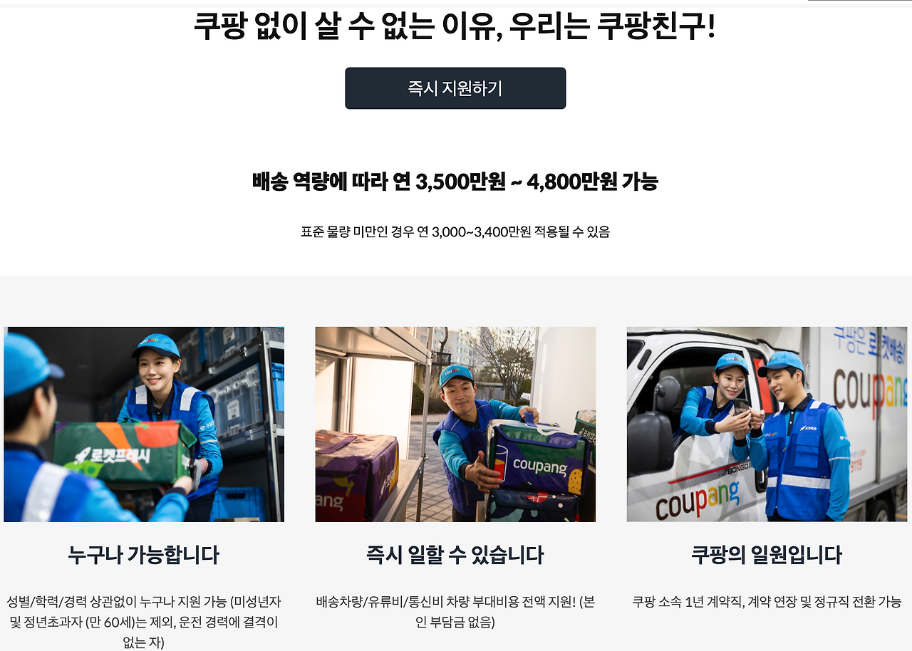 쿠팡 배송기사 '쿠팡친구' 소개 페이지. 사진=쿠팡심지어 기사에는 투웨이브 근무시간을 새벽조, 오후조 각각 언급하면서 '~을 도입하면 새벽조가 새벽 배송 서비스에 투입될 가능성이 높을 것으로 점쳐진다'라는 문장을 썼다. 투웨이브 근무체제 도입을 신선식품 새벽 배송 진출 근거로 삼아서 이런 문장을 쓴 건데 역시 건조하고 싸가지 없는 문장이었다. 내가 회사에 다니고 있는데 회사에서 갑자기 근무방식을 개편한다며 직원 의사를 고려하지 않고 새벽조, 오후조로 나누는 건 물론 날 새벽조에 투입시킨다 하면, 졸지에 내 의지와 상관없이 새벽에도 일해야 한다면 난 얼마나 빡쳤을까.