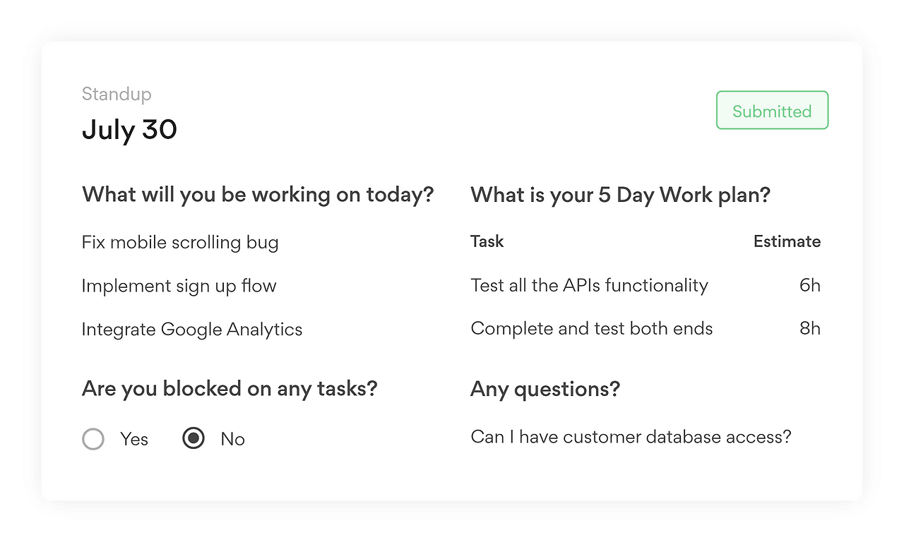 튜링 역할은 채용 징검다리에만 그치지 않는다. 이 플랫폼을 통해 일하는 개발자는 원격근무를 할 텐데 튜링 워크스페이스 소프트웨어로 시간 추적이나 가상 일일 스탠드업을 자동화한다. 엔지니어는 오늘 할 일과 주간 계획(업무별 시간)을 체크하고 기타 질문사항을 여기에 입력할 수도 있다. 원격근무에서 복무 관리가 중요하다 보니 이런 걸로 투명성을 보장하려는 것.