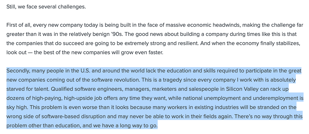 'Why Software Is Eating The World', 마크 안데르센 저. 사진=안데르센 호로위츠한편으로는 결국 IT 기업이나 기술 기반 스타트업에서 일하는 사람도, 비개발자 출신 창업자도 개발을 공부하긴 해야겠구나 싶다. 당장 완벽한 결과물을 뚝딱 만드는 건 아니더라도- 장기적으로 그걸 할 줄 아는 게 서비스를 만들고 개선하는 데 도움될 테니. GUI로만 해결하는 데에는 한계가 있을 수 있고. 정도(?)를 걸으며 기본부터 밟아야 제대로 배우고 이해하는 걸 테니. 이렇게 쓰고 보니 '코딩을 배우면 좋지만 코딩을 꼭 안 배워도 된다'라고 썼던 지난가을 글과 상충되는 느낌도?