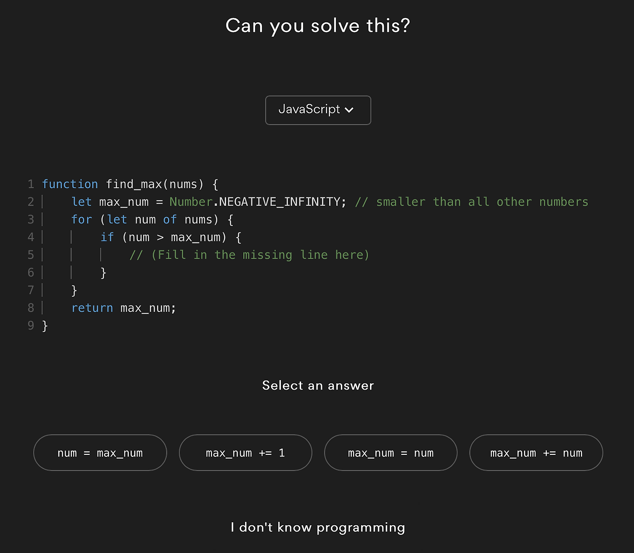 사진=튜링여기까지는 엔지니어를 구인하는 사용자 이용방법이고- 엔지니어는 이 홈페이지에 긱 일자리 플랫폼에 지원하듯 자신을 등록할 수 있다. '지원하기'를 누르니 당장 코드 문제가 나온다. '이거 풀 수 있어?' 이러면서. 문제는 자바스크립트, 파이썬, C 언어 크게 세 가지로 나뉘어 있고. 답안은 객관식인데 '프로그래밍할 줄 몰라'도 누를 수 있다(그럴 거면 여기 왜 지원하는 거?). 근데 아무 답이나 체크하니까 로그인하라고 뜬다. 미리 가입을 해야 하는 것 같다.