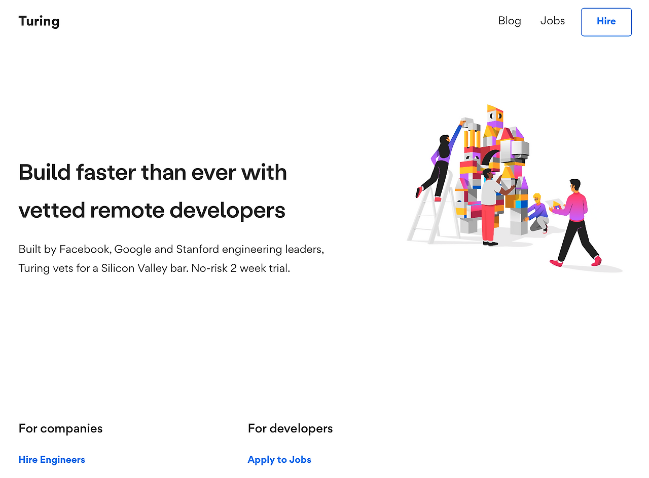 사진=튜링이 내용에 공감 간 이유는- 자료조사를 하면서 1번에 해당하는 사례를 접했기 때문이다. 한국 사례는 아니고, 실제 실리콘밸리 개발자를 긱 일자리처럼 연결해주는 채용 플랫폼이 있다. '튜링(Turing)'이라는 서비스인데 국내 서비스는 아니다. 페이스북, 구글, 스탠퍼드 엔지니어링 리더들이 구축했고 취지는 "톱 소프트웨어 엔지니어 영입하려고 구글과 경쟁하다 지쳤다면 이런 플랫폼에서 사전 검증된 시니어 엔지니어를 경제적으로 고용하라"는 것. 기술 역량, 소통 능력도 강력하고 고용주 시간대에 맞춰 일할 수 있는 엔지니어.