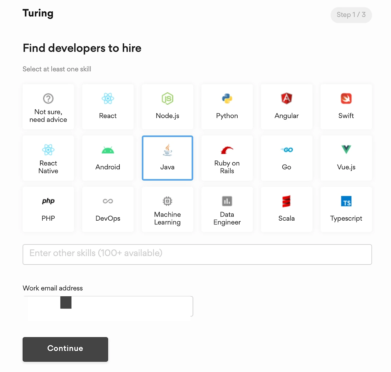 대충 입력하고 넘어가니 튜링에서 내 회사의 구체적 직무를 파악하기 위해 통화 일정을 예약하는 페이지가 뜬다. 시간대(도쿄, 서울 시간대)도 선택할 수 있고. 튜링 측과 통화하고 나면 여기서 내게 엔지니어 이력서를 보내준단다. 그다음, 나는 엔지니어와 통화하고 2주 동안 테스트 기간을 갖는다. 진짜 예약하면 안 될 것 같아서 여기까지만 확인하고 도로 나왔다. 근데 다른 언어는 어떤지 궁금해서 자바나 이것저것 누르고 다시 보니 거기도 엔지니어가 20명 넘게 있다고 나온다.