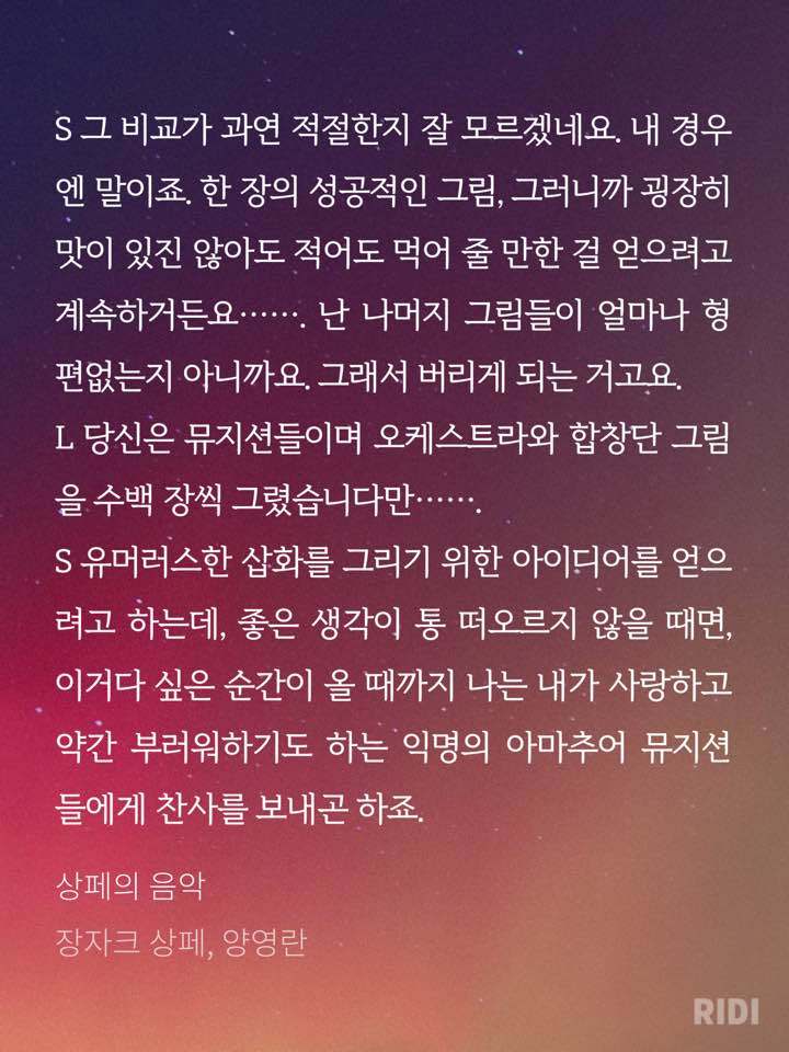 여섯째, 방황하면서 작업할 때, 깨달은 몇 가지 진리가 있다. 장 자끄 상뻬의 '상페의 음악' 인터뷰 내용과 김은희 작가가 '유퀴즈'에 나와서 한 말이 그랬다. 둘 다 비슷한 내용이었는데- 꾸준히 해야 한다는 것, 그러면서 개선해야 한다는 것, 어떻게든 자리를 지키고 밤새서 고민하는 것도 필요하다는 것, 그래야 조금이라도 쓴다는 게 그랬다. 딱 저런 멘트를 한 건 아닌데 저런 요지 이야기였고, 내가 받아들인 의미는 그랬다. 천하의 상페와 김은희 작가님도 진도를 많이 못 나가더라도 자리를 지키면서 꾸준히 작업하는데- 나 따위가 뭐라고.