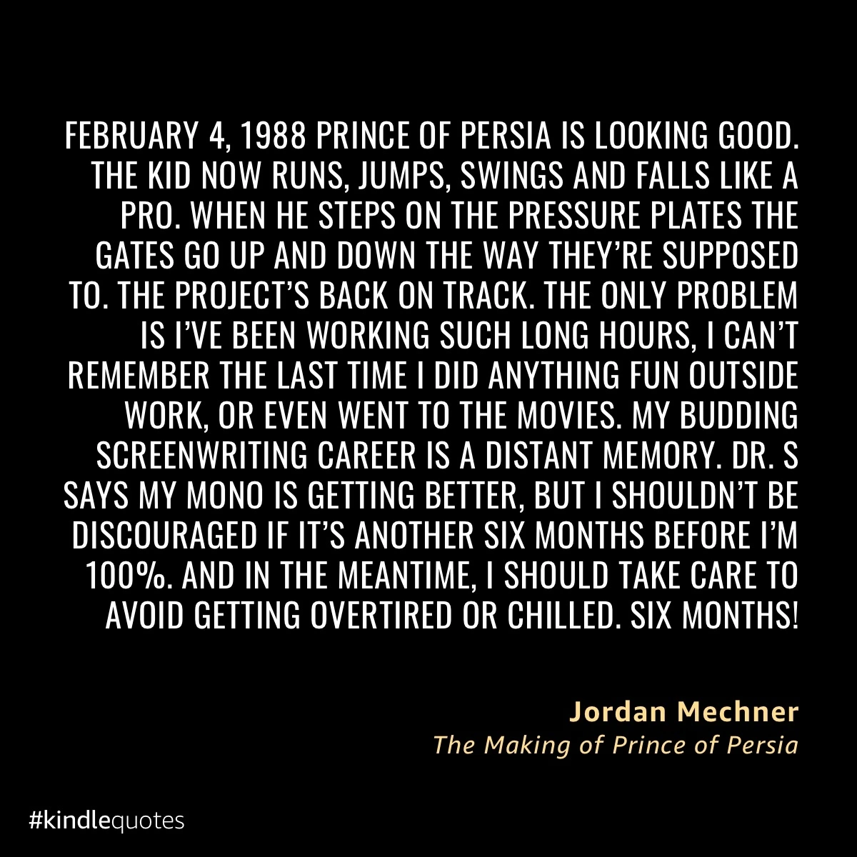 개발 일지 이야기로 돌아오자면- 이 책에는 토막글이 많다. 일기다 보니 맥락 없고 두서없이 쓴 듯한 이야기도 적잖다. 그래도 통찰을 주는 문장은 있다. 재미있는 일화나 깨달음을 주는 문장을 발견할 때면 항상 멋진 이미지(?)로 그 내용을 저장했다. 내가 킨들에서 주로 쓰는 이미지는 까만 바탕에 흰 글씨지만(눈이 아파서 이걸로 항상 저장한다). 얼마 전 SNS에 하나를 공유했다. 그것 말고도 다른 내용도 많아서 길게 풀어보고 싶었다. 글에 공감을 표시한 이들이 평소보다 많았는데- 페르시아의 왕자를 기억하는 이들이 많은가 보다 했다.