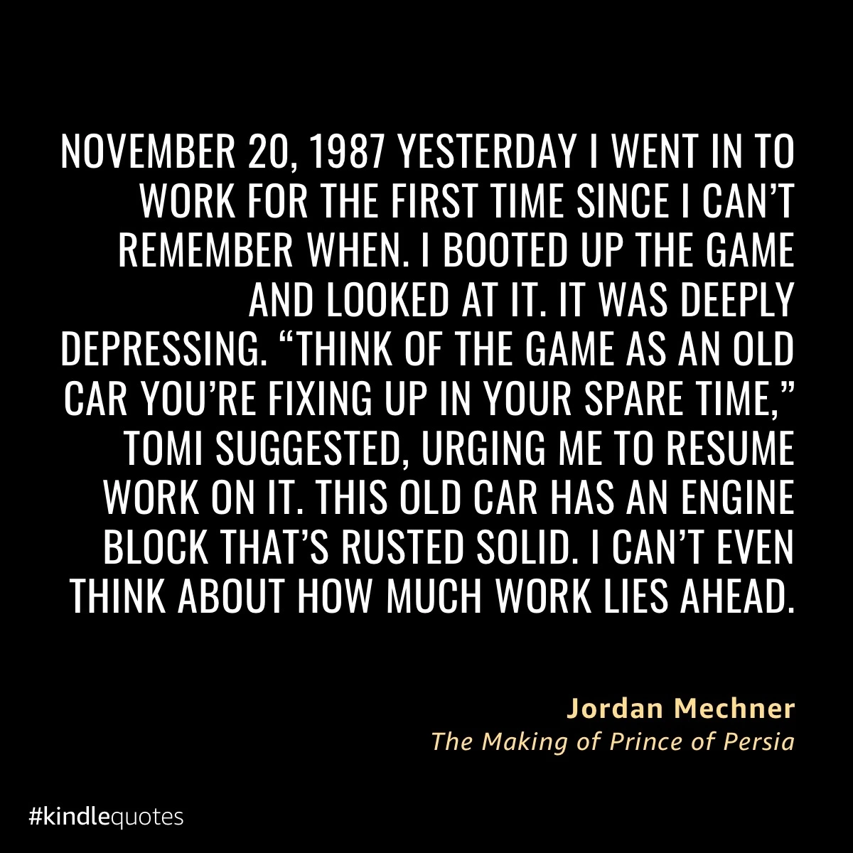 앞서 언급했지만 조던 메크너는 몇 달 동안 다른 작업을 하느라 게임 개발에 손도 못 댄 적도 있다. 오랜만에 게임을 부팅해서 들여다보고 암담했던 심정을 일기에 담았다. 그때 토미라는 인물이 "여유 시간에 오래된 자동차를 수리하는 것처럼 게임을 생각하라"라고 제언한다. 문제는 그 오래된 차 엔진 블록은 단단히 녹슬었다는 것. 작업하지 않은 지 너무 오래된 데다 어디서부터 손대야 할지 모르겠다 싶을 정도로, 아니 얼마나 손대야 할지 막막할 정도로 갈길이 구만리처럼 느껴지는 심정을 생생하게 담았다.