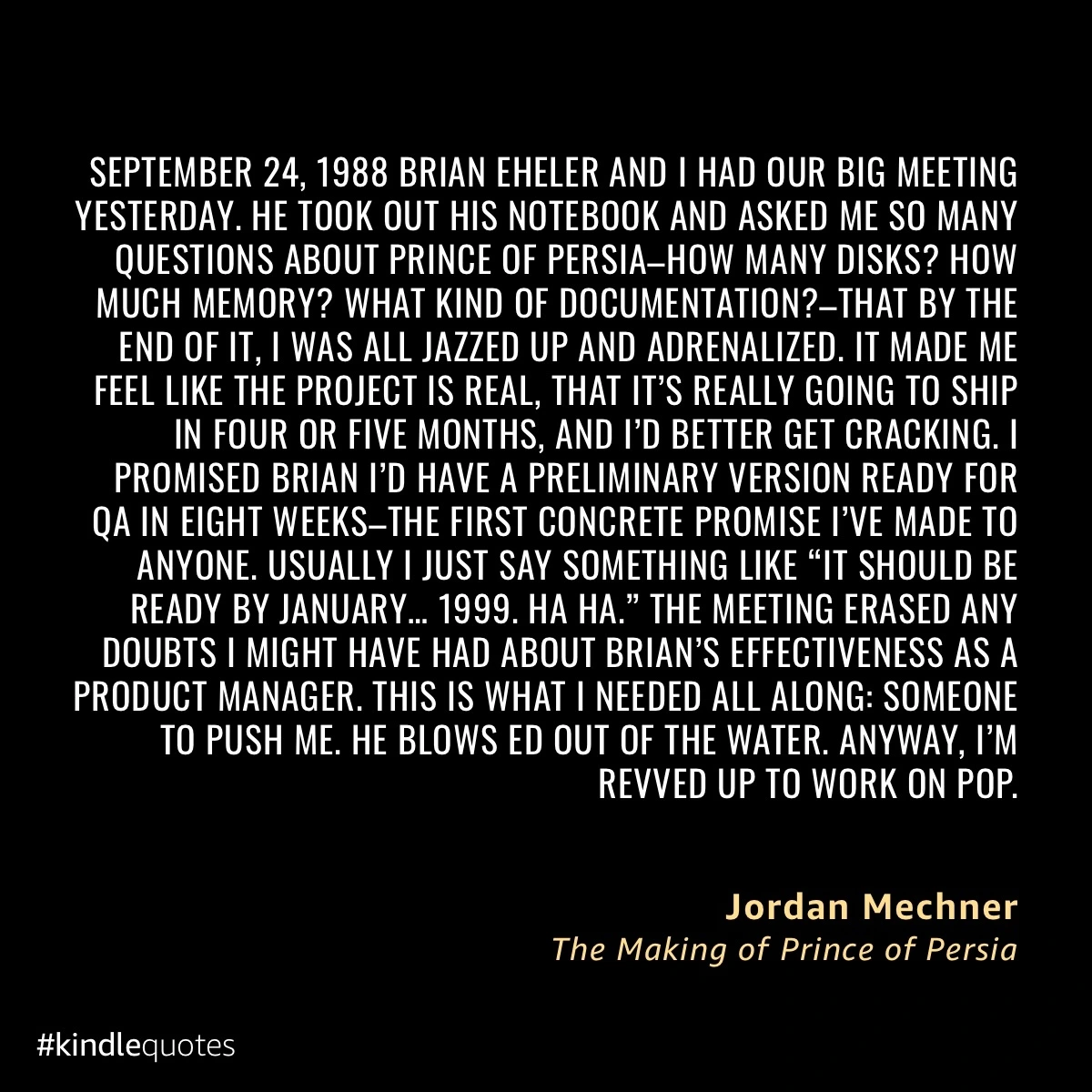 출처=킨들읽다가 약간 웃기기도 했던 내용인데- 브라이언 에펠러라는 프로덕트 매니저와 미팅 이야기다. “그가 공책을 꺼내서 게임 진행상황을 묻는데 디스크, 메모리는 어느 정도 들고, 어떤 종류의 도큐멘테이션인지” 질문한다. 조던 메크너는 그런 질문을 받고 나서 기분이 좋았는데- 프로젝트가 실제라는 느낌도 들고, 4~5달 안에 출고될 것 같고 일이 진행되고 실체가 보인다는 생각에 신났던 것 같다. 심지어 “8주 안에 예비 버전이 준비될 거라는 구체적 약속까지 했다. 누군가에게 처음으로 구체적으로 한 약속이라고”.