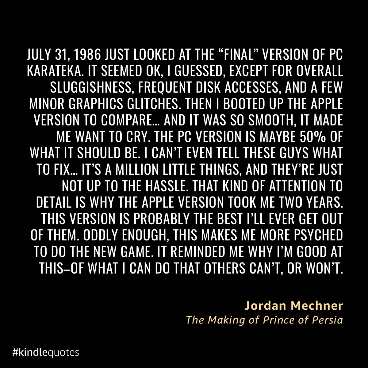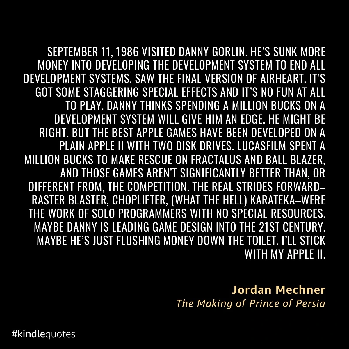 출처=킨들조던 메크너 의도는 그게 아니었을 수 있지만- 내가 받아들인 의미는 그랬다. 그가 대니 골린을 만난 이야기인데 “그가 모든 개발 시스템을 끝낼 개발 시스템을 개발하는 데 막대한 돈을 쏟아붓는다”는 이야기. 그걸 들으면서 조던 메크너가 떠올린 생각이었다. 개발 시스템에 막대한 투자를 하면 이점이 있을 거라고 당사자는 생각하는 듯하고 그게 맞을 수도 있지만- "최고의 애플 게임은 디스크 드라이브가 두개인 평범한 애플 2 컴퓨터에서 개발됐다"는 사실을 조던 메크너는 짚고 넘어간다.
