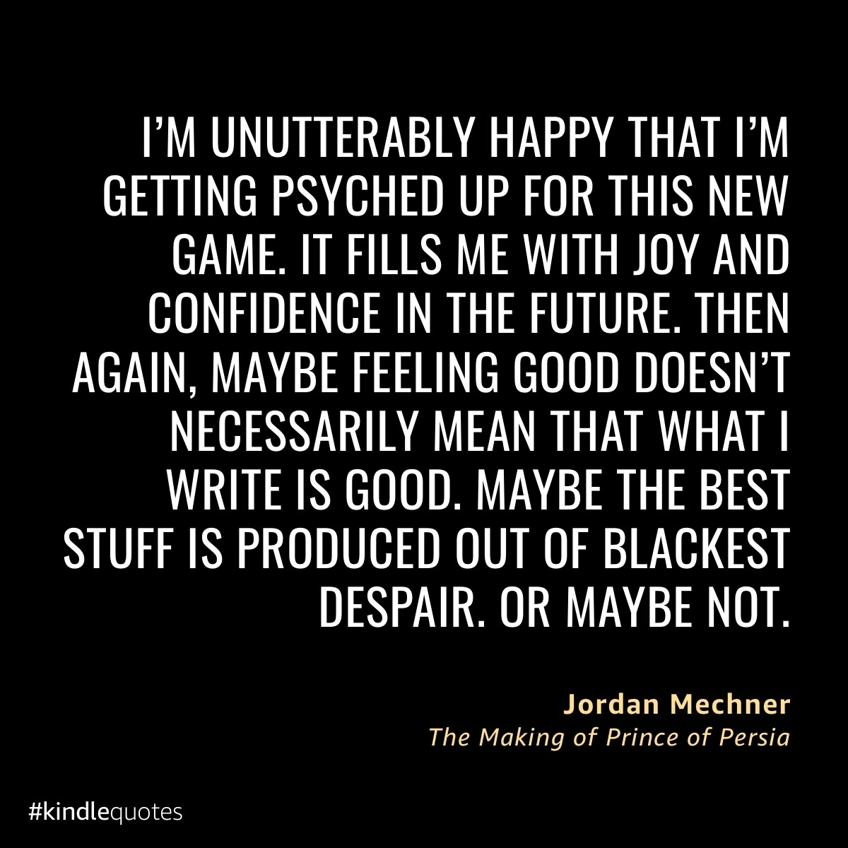 앞으로 어떤 미래가 펼쳐있는지, 그 게임이 얼마나 히트 쳤고 인정받았는지 가늠할 수도 없는 20대 시절 조던 메크너를 보면 짠한 느낌도 든다. 종일 틀어박혀서 일만 하고. 시나리오 작업도 해야 하는데 두 마리 토끼를 동시에 잡을 수 없는 상황에 또 막막하고. 미래를 볼 줄 아는 사람이 그 시절 그에게 '너 잘 될 거야’라고 알려주면 마음이 편했을까. 글쎄. 그러면 페르시아의 왕자가 잘 나오기 어려웠을지도 모르겠다. 불확실한 미래, 불안감이 더 잘 해내는 동력이 될 수 있으니까. 불안이 싫어도 그게 주는 유익을 무시할 수는 없다.