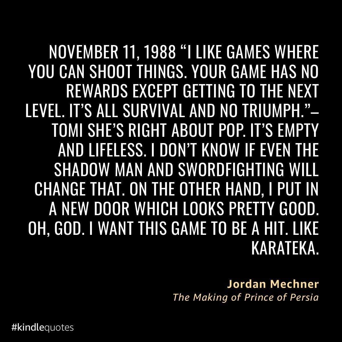 출처=킨들책을 읽다 보면 페르시아의 왕자 개발과정에서 느낀 구체적인 고민이 나온다. 다음 단계로 가는 것외에 보상이 없는 거나, 공주를 구하는 것 외에 목표가 없는 거나, 적이 없는 거나. 다 메모했지만 게임 그 자체에 대한 내용이라 여기에 포함하지는 않았다. 세세한 고민이 좋았다. 내가 페르시아의 왕자를 해본 적 없어도- 뭔가 만들기 위해 치열하게 고민하고, 이것저것 구상한 흔적을 활자로 접하니- 이 또한 역사적 게임이 탄생하기까지 과정을 세세히 담은 소중한 기록이라는 생각도 들었다. 내 콘텐츠 회고 의미도 돌아보고.