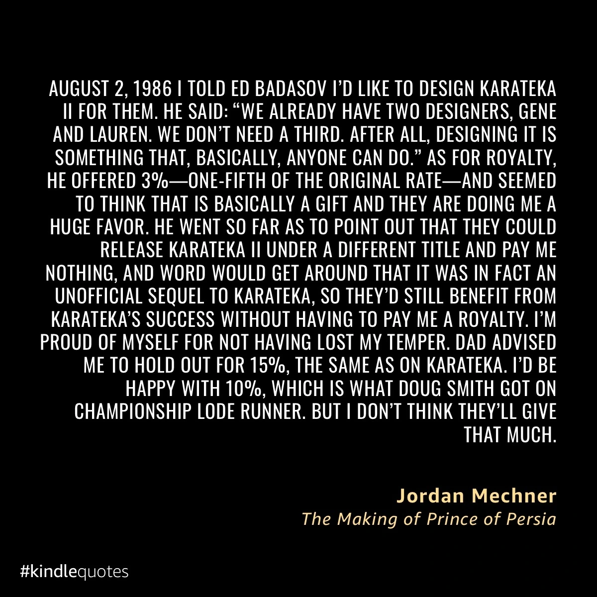 출처=킨들이 책에는 조던 메크너가 카라테카 2 버전 디자인에 참여하고 싶다고 의사를 밝힌 이야기가 나온다. 상대방은 거절한다. ”이미 디자이너가 둘이나 있다고. 세명은 필요 없다”고. 이어서 로열티 이야기도 나오는데 “3%를 제안받았다”고 한다. 원래 요율의 5분의 1 수준이라나. “조던 메크너 아버지는 15%를 받으라고 조언하고, 그는 10%라도 좋겠다는 생각인데 그만큼 받을 수 있을 거란 기대는 안 하고 있다. 심지어 로열티를 한 푼도 안 주고 다른 타이틀로 게임을 낼 수 있다는 이야기도 있으니.”