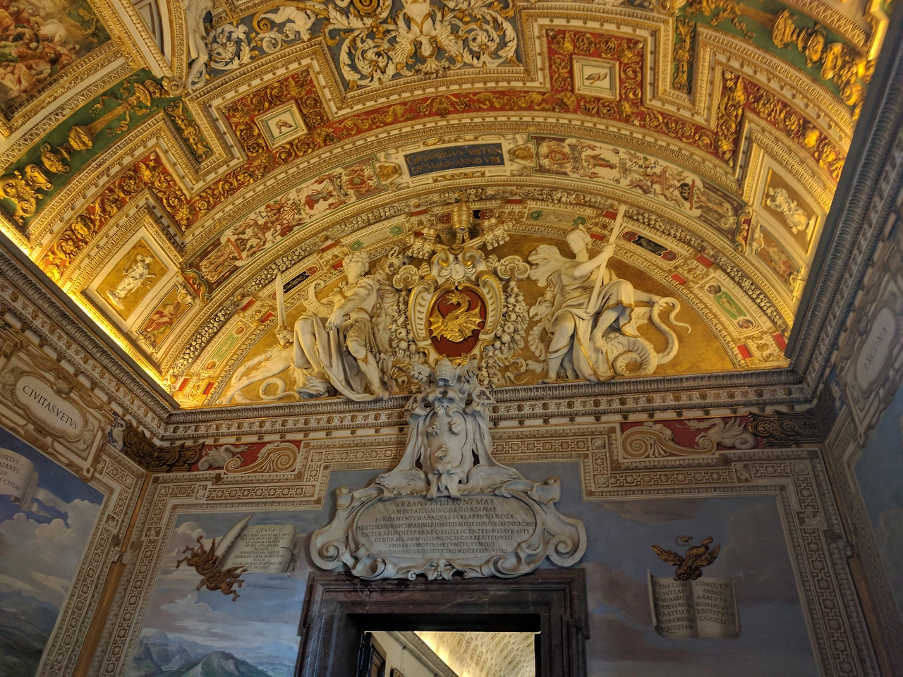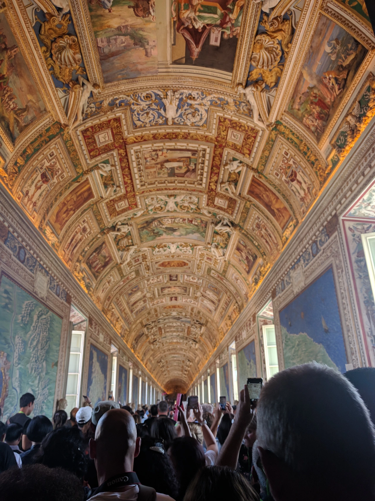 점심을 먹은 뒤에는 바티칸에 갔다. 사실상 로마 여행 마지막 코스. 바티칸은 볼 게 어마어마하다. 웬만한 건 둘러보고 숙소 주변을 산책하면서 로마에서 마지막 여흥을 즐기는 것도 좋겠다 싶었다. 참고로 서유럽에서 묵은 숙소 가운데 로마 숙소가 가장 좋았다. 바티칸에는 각종 조각이나 볼거리가 넘쳤는데 내가 찍은 사진을 보면 주로 천장을 찍은 게 많다. 천장에도 화려하게 그림이 그려져 있어서 시선을 거둘 수 없었다. 사람이 많다 보니 천천히 걷게 되는데 그렇다 보니 천장을 여유 있게 관람할 수 있었다. 미술품처럼.