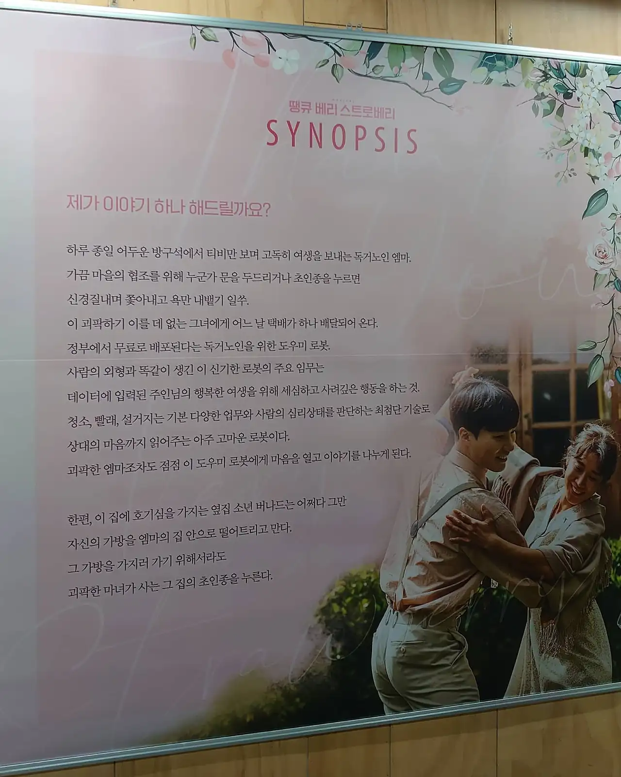 로봇 이야기로 시작해서 동떨어진 이야기를 하고 있는데- 줄거리로 다시 돌아와야겠다. 스포일러가 좀 될 수 있을 듯한데- 땡큐 베리 스트로베리는 남편과 딸을 잃고 혼자 집에 틀어박혀 살고 있는 노년의 엠마가 주인공이다. 그의 집에 '데이케어 로봇'이 왔는데- 집안 곳곳을 청소하고, 정돈하며, 엠마에게 먹을 걸 챙겨주고, 건강도 살핀다. 외곩수에 괴팍한 엠마에게는 너무 성가신 존재. 처음에는 많이 구박했지만 막상 그에게 나사가 빠지고 작동이 되지 않을 때는 엠마도 당황해서 어쩔 줄 몰라한다.