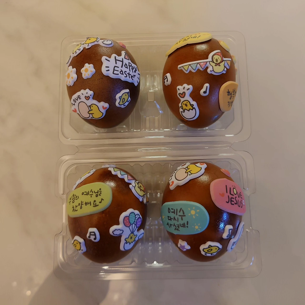 토요일 밤부터 부활 주일 달걀을 꾸미기 시작했다. 원래 집에서 달걀을 삶으려 했는데 느낌적 느낌이지만 금방 먹어야 하는 부담이 있어 소비기한이 더 길어 보이는 훈제란을 샀다. 달걀을 1인당 하나씩 드리려 해서 우선 4알 샀다. 훈제란에 양념이 있는 줄 몰랐는데 냄새가 났다. 안 좋은 냄새는 아니고 그냥 훈제란 냄새인데 다음에 훈제란은 사지 말아야겠다 싶었다. 손에 냄새가 배니까.