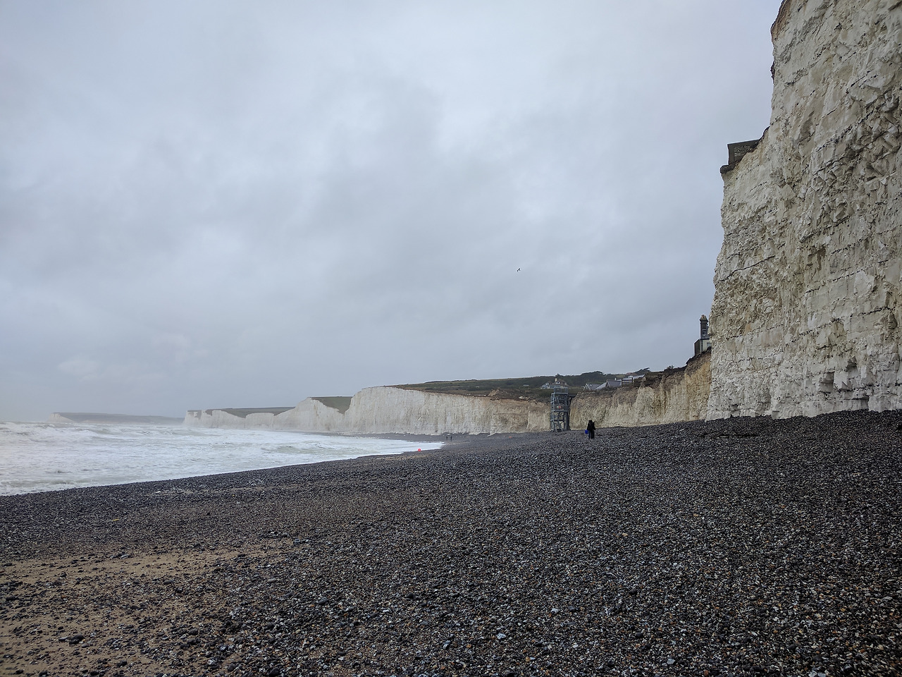 비바람과 사투를 벌이며 걷다 보니 서서히 또 다른 바닷가가 눈 안에 들어왔다. 역시나 브라이튼처럼 그 바다의 파도도 무시무시했다. 드디어 세븐 시스터즈에 도착한 것. 그러나 너무 정신없었다. 거센 바람 때문에 숨쉬기도 힘들고 바람이 자꾸 날 떠다 미는 느낌이었으니까. 화장실에서 머리를 단단히 묶고 세븐 시스터즈의 흰 절벽과 바닷가를 마주했다. 아. 감탄사가 저절로 나올 정도로 너무 절경이었다. 끝없이 펼쳐진 바다도, 울퉁불퉁한 흰 절벽도. 세븐 시스터즈의 흰 절벽은 비, 바람, 파도, 눈이 깎아놓은 자연의 산물이었다. 세븐 시스터즈라는 이름은 항해 중이던 어느 뱃사람이 지었다고 한다. 절벽에서 치솟은 부분이 7개 정도인데 내 눈에는 그것보다 많아 보이기도 했다.