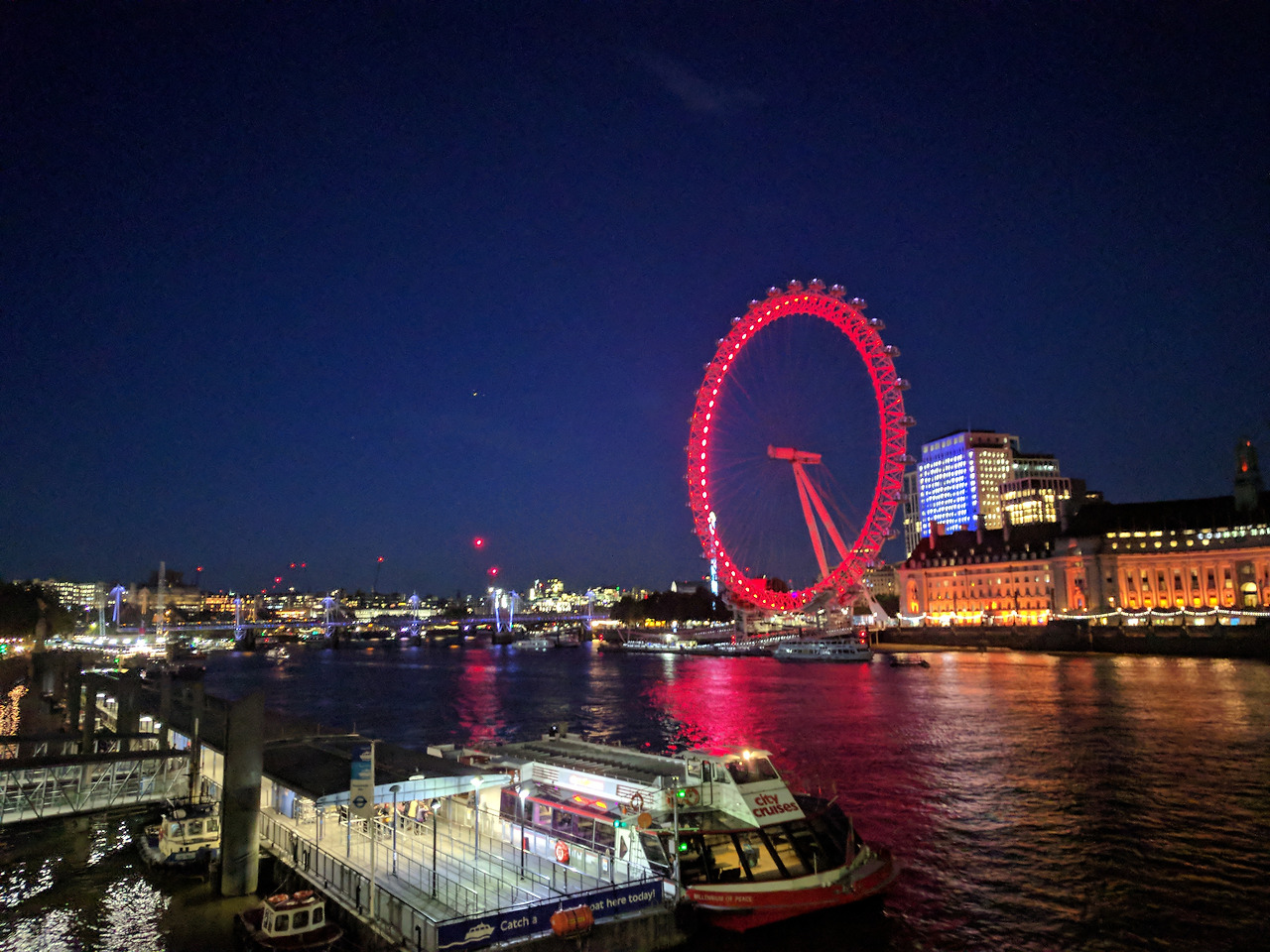 웨스트민스터 사원에도 기념품을 파는 상점이 있어서 이곳을 둘러봤다. 이어서 웨스트민스터 다리를 건너 사우스뱅크 쪽으로 향했다. 탬즈강과 런던 아이 야경은 멋졌다. 웨스트민스터 다리는 한강 다리에 비하면 꽤 짧아서 금방 건넜다. 평일 저녁에 런던 야경을 구경하며 탬즈강을 건너다니. 흡족했다. 이제야 휴가를 온 게 실감 났다. 현지인들의 일상도 보다 가까이서 보이고. 다리를 건너다 중간에 우버의 점프 전기 자전거를 보고 사진도 찍었다. 런던 아이도 찰칵찰칵. 사우스뱅크 쪽에 와서는 오락실을 구경하고산보하듯 걸었다. 하루 일과를 마친 한 무리가 오락실 앞에 모여서 환호성을 지르는 모습이 귀여웠다. 길거리에는 한 연주자가 영화 '미녀와 야수' OST를 바이올린으로 연주했다. 마치 내 런던 방문을 환영하는 연주처럼 들렸다. 런던 아이는 운행하지 않았는데 이날만 그랬는지 아님 평소에도 그런지 잘 모르겠다.