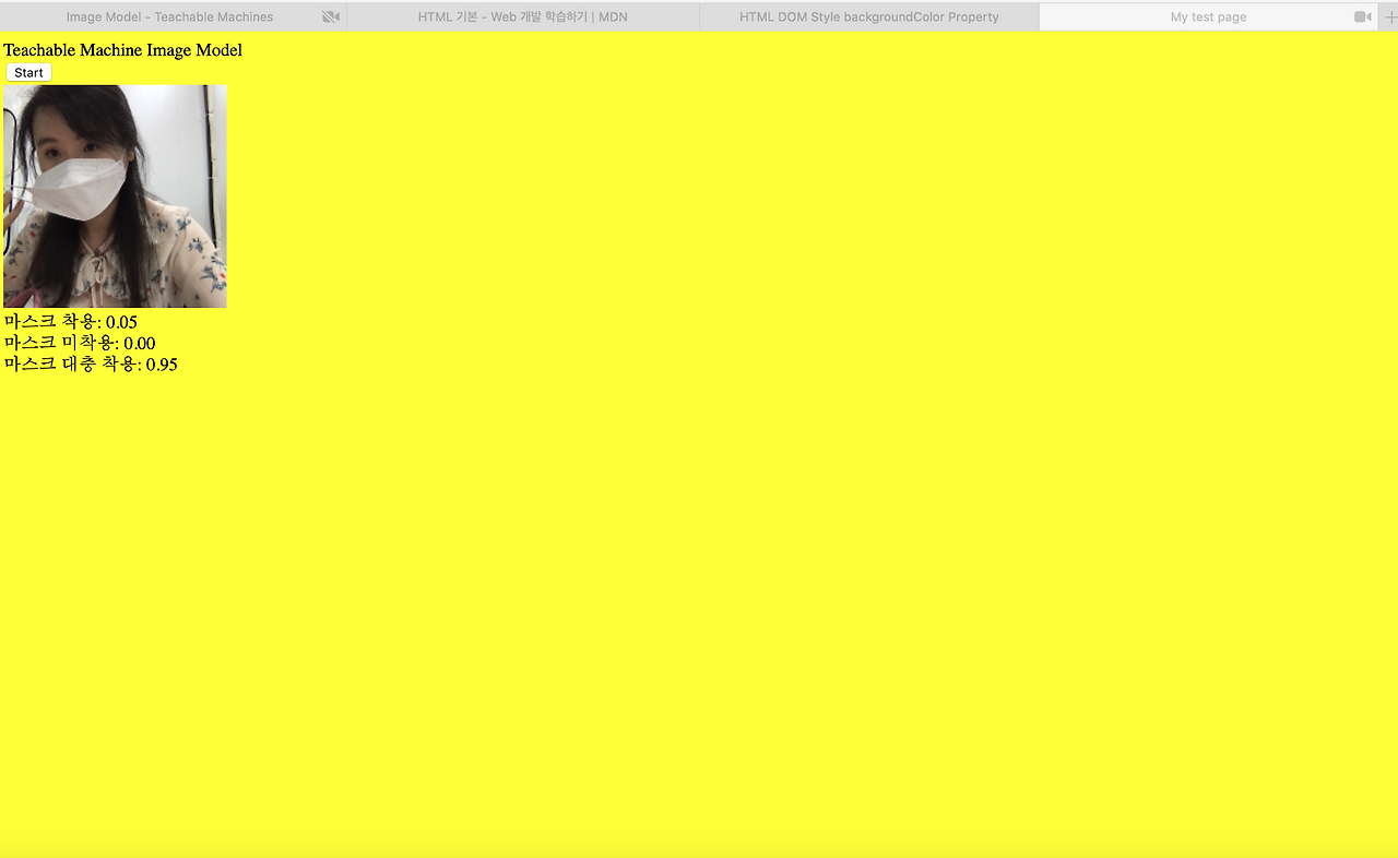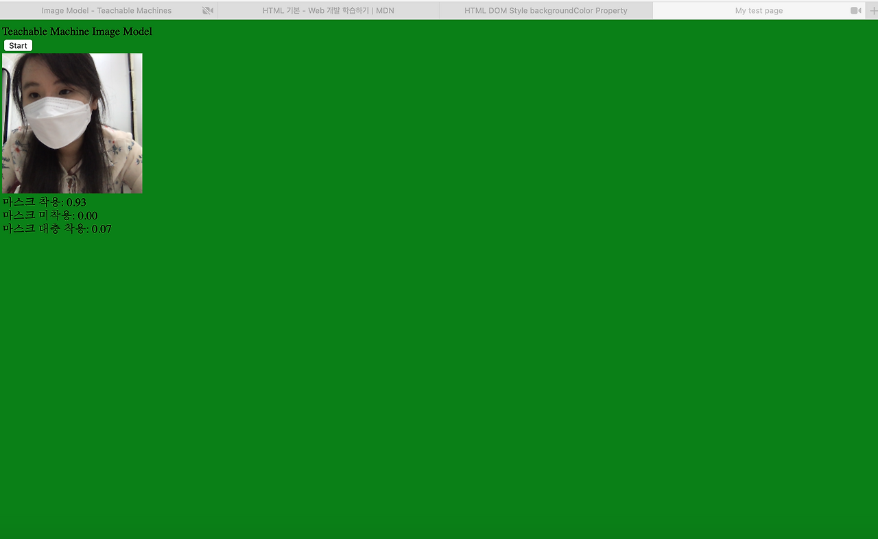 if, else if 적용한 다음, 마스크 착용 여부에 따라 홈페이지 바탕색이 바뀌는 모습. 사진=딱정벌레