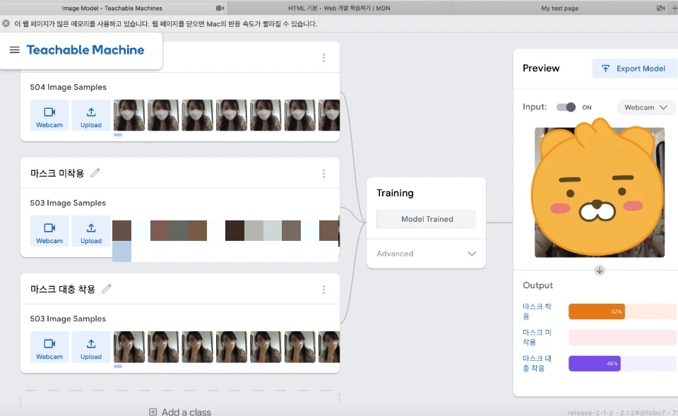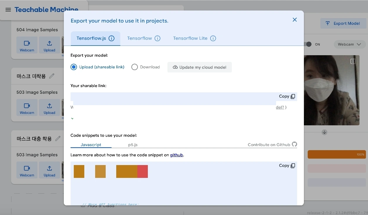 그 다음 'Export Model'을 눌러서 해당 이미지 인식기 코드를 확인했다. 중간에 뭘 눌렀는데 지금 이동 중이라서 생각이 안 난다. 아무튼 이걸 긁어서 복사했다. 홈페이지 만드는 데 필요한 코드('html 기본코드'를 검색어로)를 구글에서 검색했고 이걸 또 복사하고 바디 사이에 있는 기존 주소 대신 해당 이미지 인식기 코드를 붙여 넣기 했다. html로 저장하고 이를 여니까 이미지 인식기 홈페이지가 열렸다. 화면에 실시간으로 내 모습이 나오고 마스크 착용 여부를 인식했다. 관련 숫자가 막 올라가고.