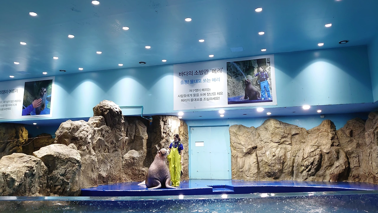 일산 아쿠아플라넷 바다코끼리. 사진=딱정벌레바다코끼리 매리는 물대포도 곧잘 쏘고, 식성이 엄청났다. 거의 쉬지 않고 계속 물고기를 먹고 있었다. 무게도 꽤 나간다고 했던 것 같다. 그 무게로 어떻게 그리도 유연하게 헤엄치는지 신기했다. 휘파람도 곧잘 불고. 아쿠아리스트의 얼굴과 목소리도 구분한다니. 똑똑하다. 펭귄도 인상 깊었다. 걸을 때는 뒤뚱뒤뚱 느리기만 한데 헤엄은 엄청 빨리 쳤다. 수족관인데 사막여우도 있고, 원숭이도 봤다.