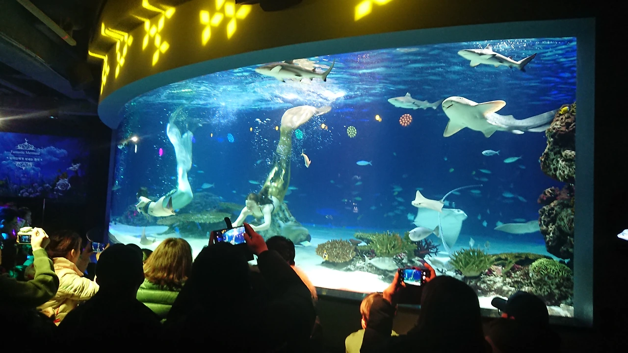 63 빌딩 수족관 인어공주 쇼. 사진=딱정벌레그러고 2018년 1월 초에 63 빌딩의 수족관에 갔다. 한화 아쿠아플라넷. 주말에 시체 놀이하다가 저녁 앞두고 부랴부랴 목도리 두르고 나가서 오후 7시 인어공주 쇼를 본의 아니게 시간 맞춰서 봤다. 그걸 보니 10여 년 전 해운대에서 봤던 인어공주 쇼가 떠오르고. 서른이 넘어도 인어공주 쇼는 여전히 설레고 들뜨고 재밌었다. 내용은 순수하게 인어공주 이야기는 아니고 여러 이야기를 짬뽕했지만.