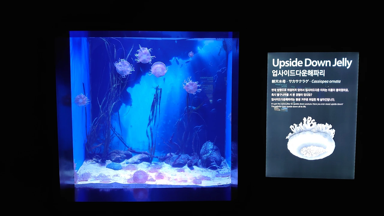 일산 아쿠아플라넷 업사이드다운해파리. 사진=딱정벌레비버도 봤는데 마침 식사 때라서 그런지 사과를 얇게 썰어놓은 걸 나눠주는 걸 봤다. 근데 두 손을 발발 떨면서 사과 조각을 받아 들고 그걸 입에 물고 헤엄을 치다가 어디 구석에 가서 누가 뺏어먹을까 조심스럽게 먹는 모습이 참. 귀여웠다. 내 옆에 있던 어린이도 비버가 두 손으로 공손하게 사과 조각을 받는 걸 보고 "귀여워"라고 외쳤다('네가 더 귀엽습니다만').