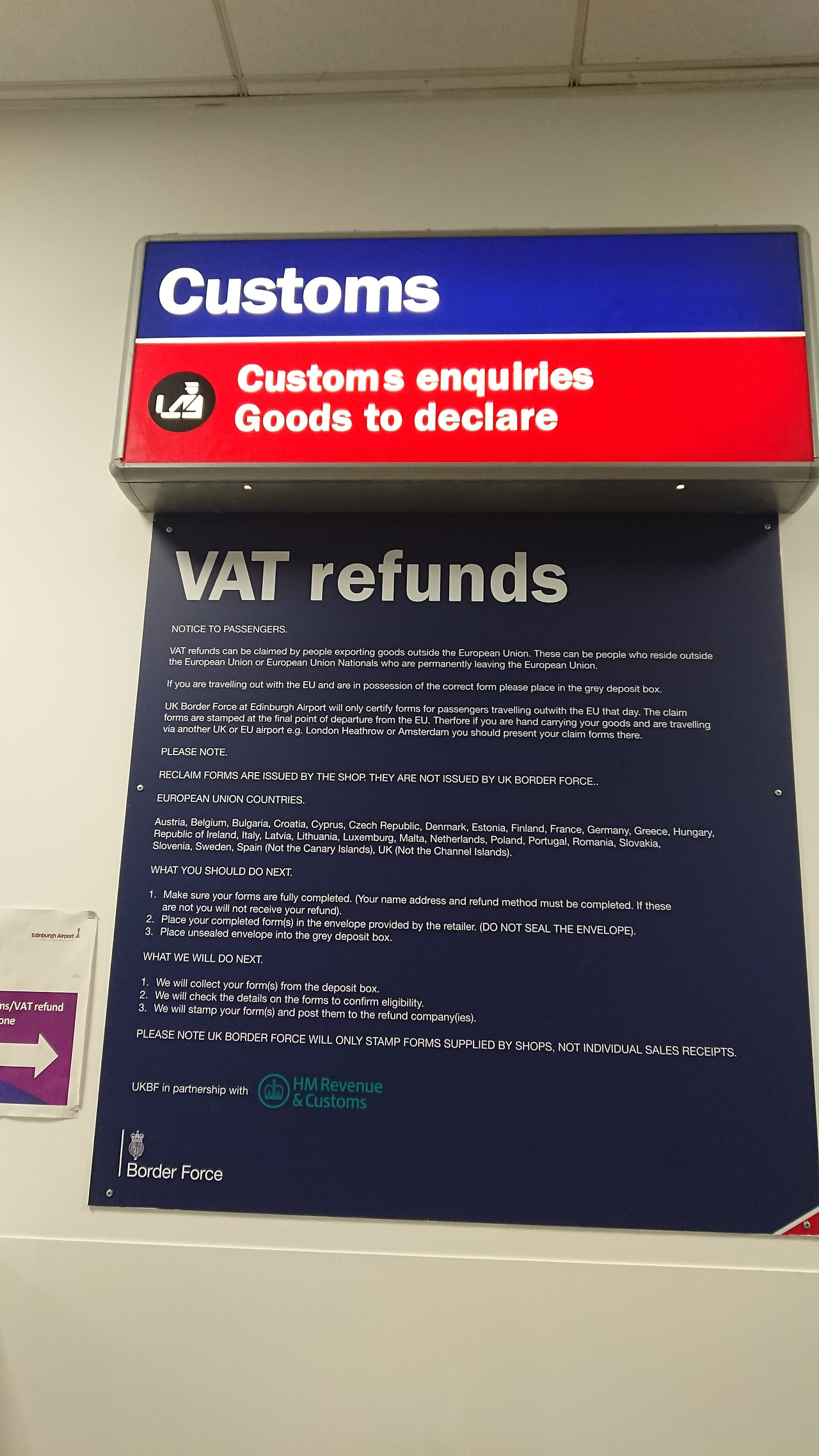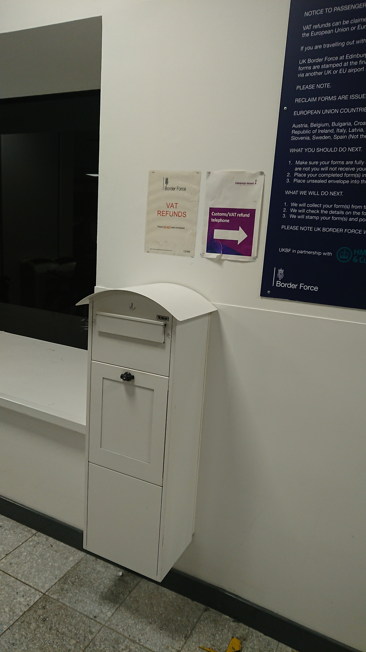 에든버러에서 영국을 떠나는 경우라면 거기서 관련 서류를 제출하면 되는 모양이었다. 세관 코너 근처에는 우체통 같은 게 있었는데 거기에 영수증과 관련 서류를 봉투에 넣는 식이었다. 근데 봉투가 따로 봉해져 있지 않았다. 게다가 누구나 그 우체통을 열어볼 수 있어서 '이거 좀 위험한 거 아닌가'하는 생각도 들었다. 옆에 전화기가 있어서 세관 담당자에게 전화해서 물어봤다. 원래 봉하지 않는 거고 작성해서 그냥 그 안에 넣으면 된다고. 알아보니 우리는 여기서 그걸 할 필요는 없었다.