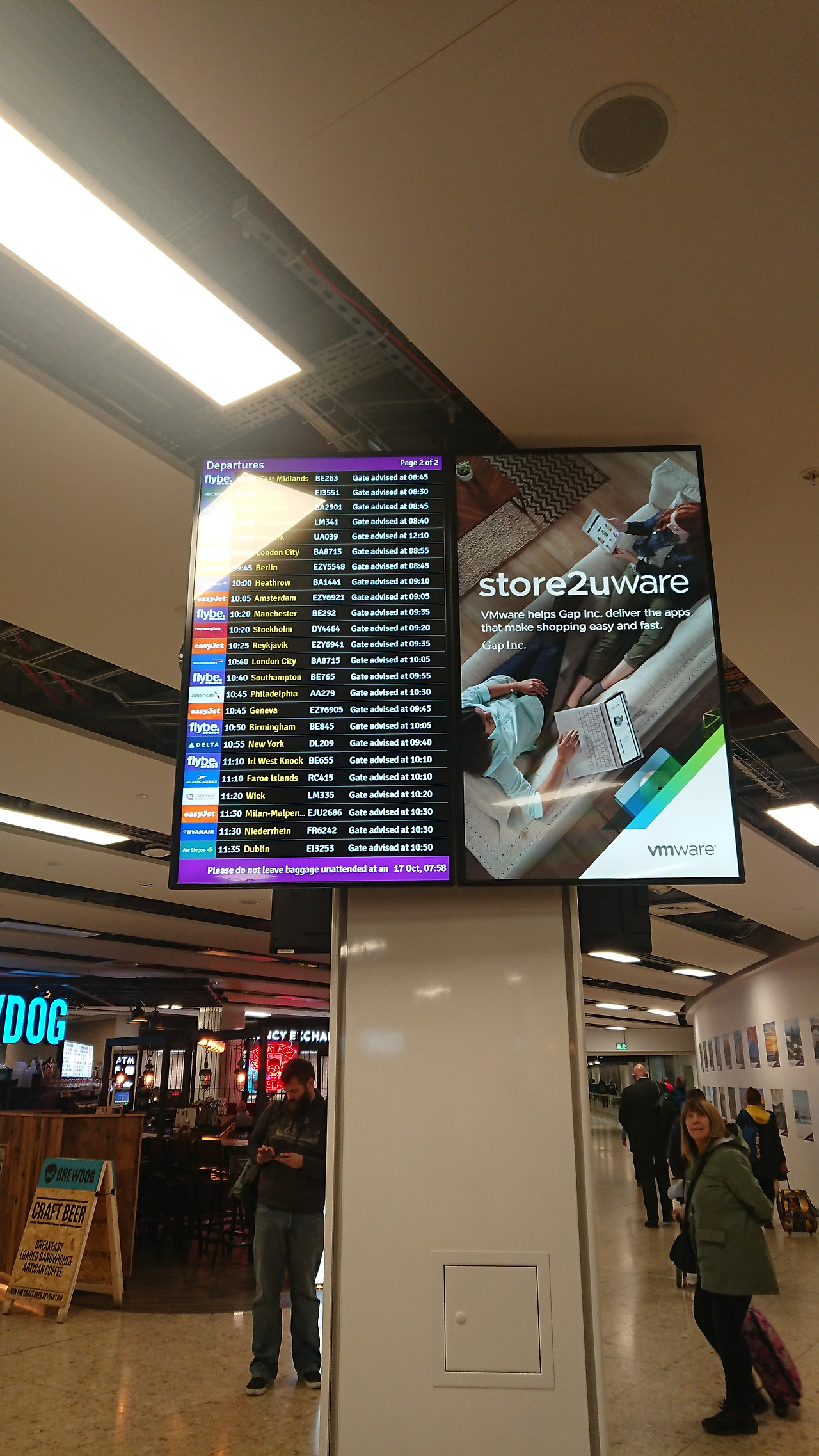 1번 에든버러 공항 내 VM웨어 광고, 2~3번 해리포터 기념품 가게, 4번 비행기별 출발 시간표. 사진=딱정벌레