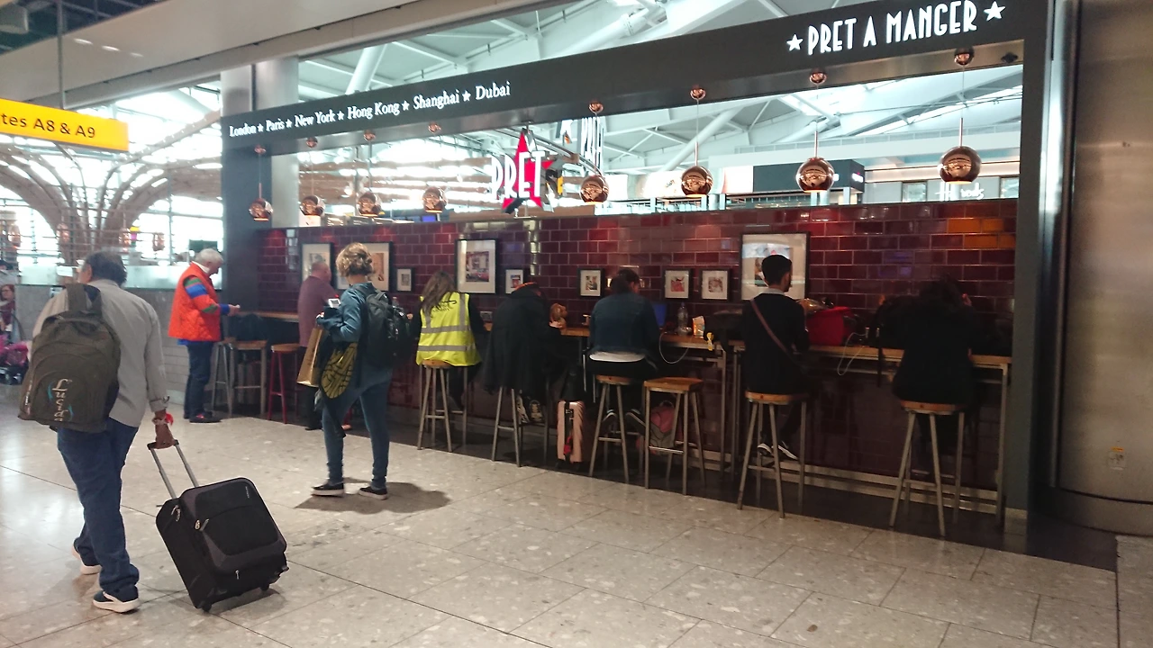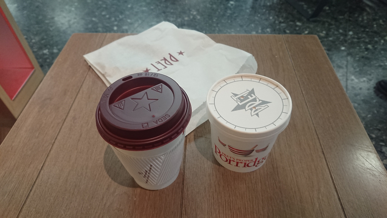 아침을 못 먹어서 간단히 끼니도 때우고 싶었다. 현지를 떠나기 전에 최대한 그 나라 브랜드를 이용해 보고 싶었다. 코스타 커피, 그렉스, 카페 네로 다 가고 프레타망제를 못 가봤다. 공항에 마침 그 매장이 있었다. 근데 이름에서 프렛만 따서 쓰는데 무슨 차이인지 모르겠더라. 어쨌든 거기서 따뜻한 오트밀과 커피를 샀다. 바나나나 치아시드 같은 거라도 넣으면 좋은데. 알아서 넣으라는 건지 뭔지 모르겠지만 아무것도 없었다. 그냥 쌀 끓인 죽 먹는다고 보면 됨. 동전이 많아서 최대한 털고 가기 위해 안간힘을 썼다. 리들에서 쇼핑이라도 할걸.