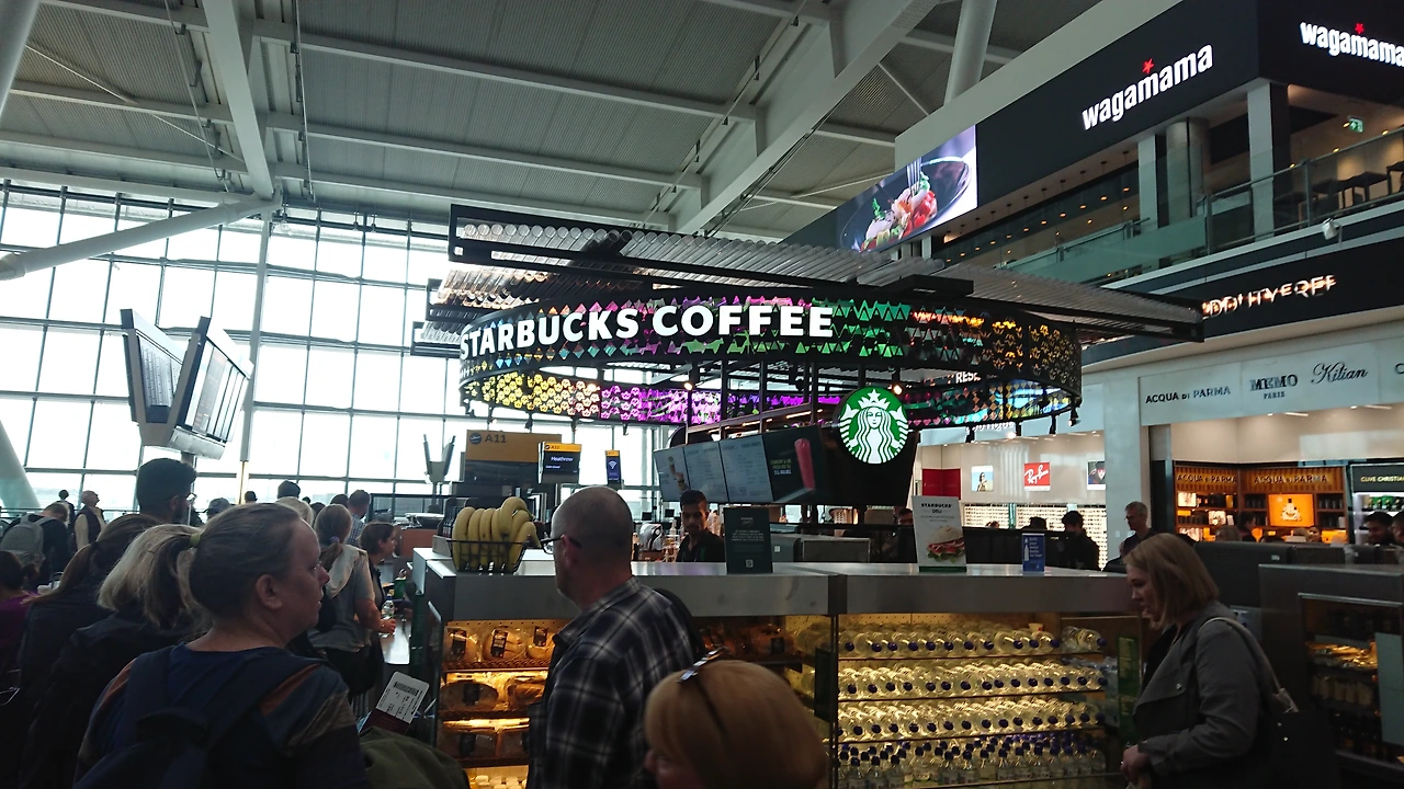 히드로 공항은 정말 시장통. 좌석마다 사람들이 빼곡히 앉았다. 스타벅스는 사이키델릭 해 보이고, 프레타망제 매장도 에든버러 공항보다 좌석을 더 예쁘게 꾸민 듯했다. 유아 히어 에디션 같은 시티 머그는 공항 말고 시내에서 사길. 공항에서 파는 건 더 비싸니. 눈앞에 포트넘 메이슨, 버버리, 불가리, 구찌, 프라다, 샤넬 매장이 펼쳐졌다. 내 관심사는 아니었다. 포트넘 메이슨 매장은 신세계백화점 본점에도 있고(요즘도 있는지 모르겠지만). 해롯 백화점이 소규모로 여기에도 있어서 어떤가 궁금했는데 그냥 그랬다.