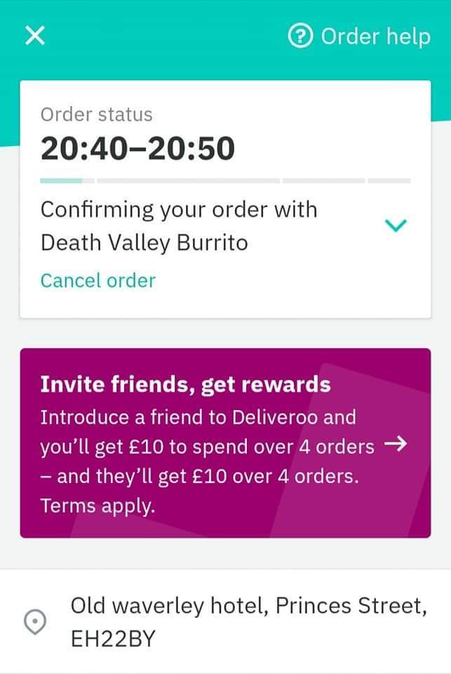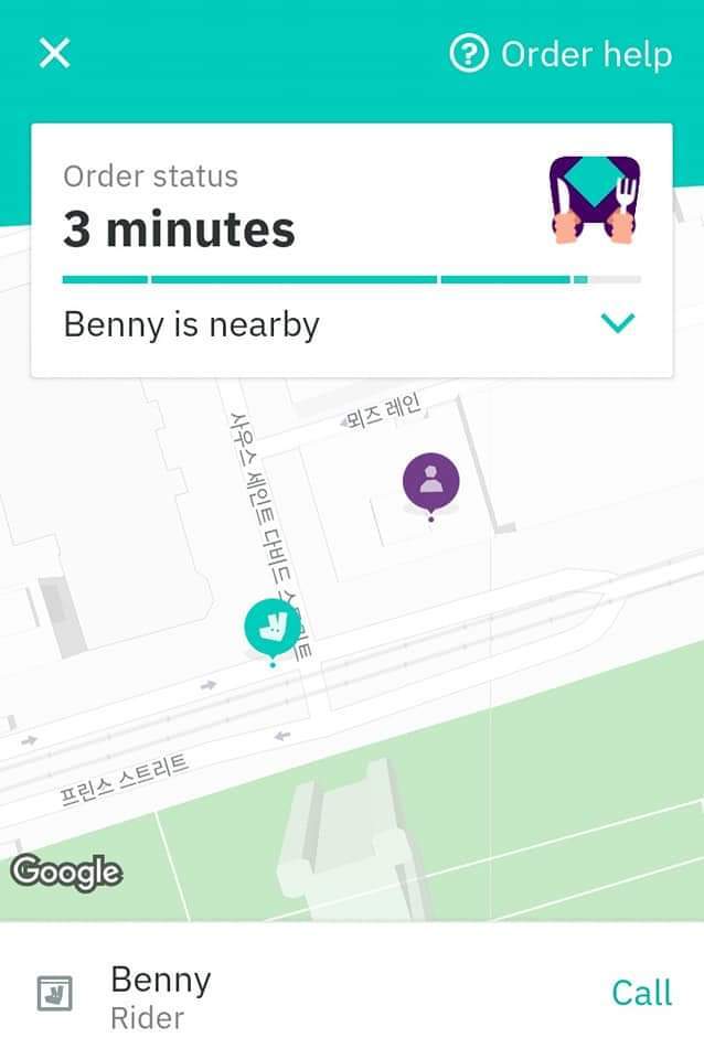 에든버러에서 마지막 밤을 보낼 때, 드디어 딜리버루 서비스를 이용했다. 저녁을 못 먹은 까닭도 있지만 현지에서 마지막 시간을 보내니까 못해본 거 다 해보고 싶었다. 외사촌 동생과 멕시코 요릿집에서 브리또와 그릴드 치킨 조각을 주문했다. 딜리버루 앱 UI는 깔끔했다. 빨리 배달되는 식당을 따로 보여주고, 배달 소요시간도 미리 보여주고. 내 배달원이 누군지 이름도 알려주고. 실시간으로 준비 현황을 푸시 알림으로 보여주는데 이제 쿠팡 잇츠나 배달의 민족에서도 지원하는 기능이다. 결제하고 나면 이메일도 왔다.