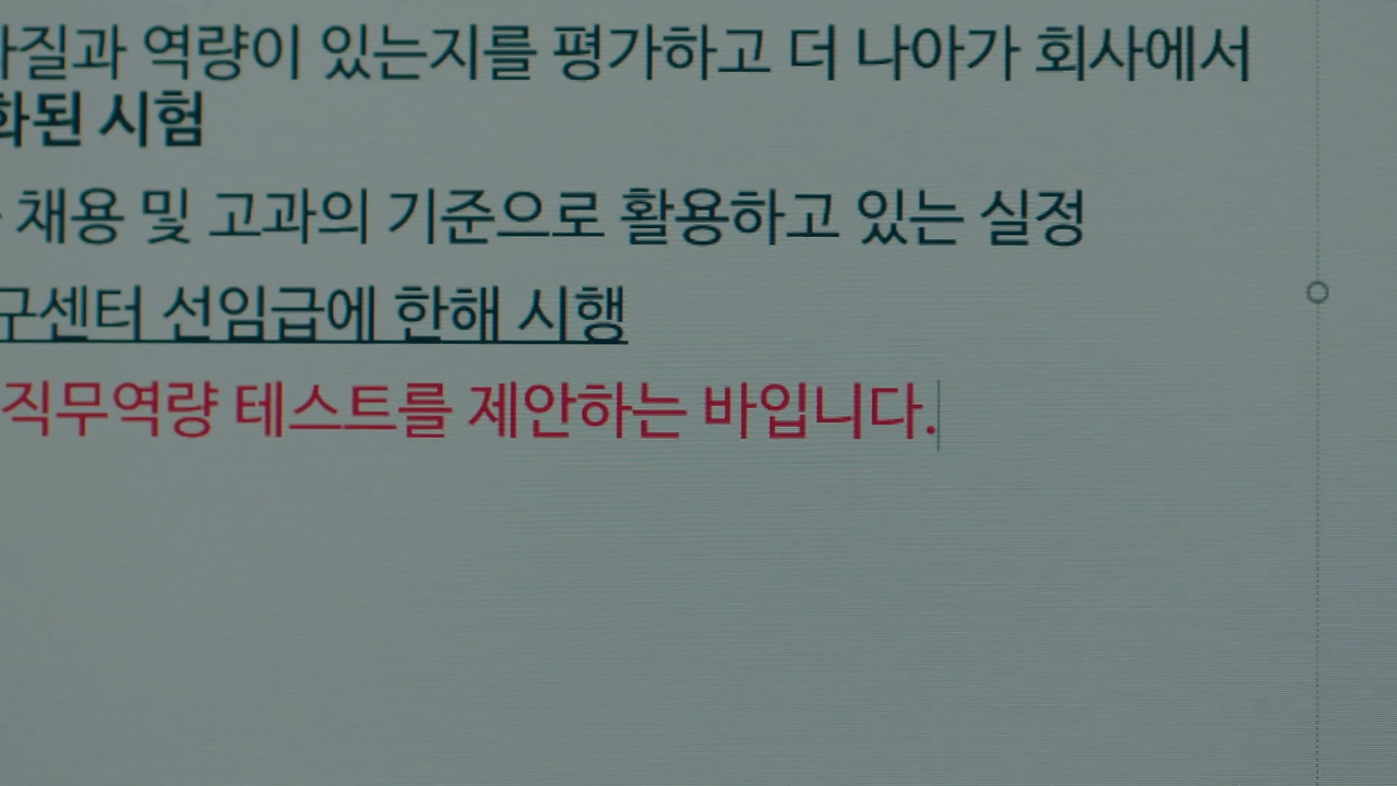 이뿐만이 아니다. 갑작스레 정규직 인력 80%를 40%로 감축하라는 본사 상무의 명령에 자영은 “정규직을 절반이나 무슨 수로…”, “우리나라는 노동법이 있고, 그게 그냥 폼으로 있는 게 아니”라고 반박해보지만 소용없다. 자영은 특단 조치로 사원들을 대상으로 하는 직무역량 테스트를 제안하고, 그마저도 센터장에게 환영받지 못한 채 공개적인 수모를 당한다.