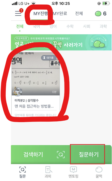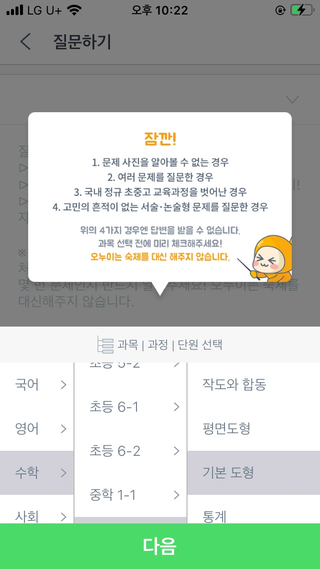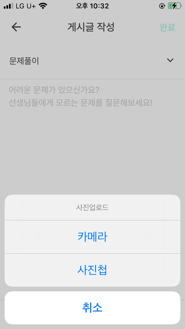 사진 올리기 → 질문하기 페이지: 과목/과정/단원 선택 → 질문내용 입력