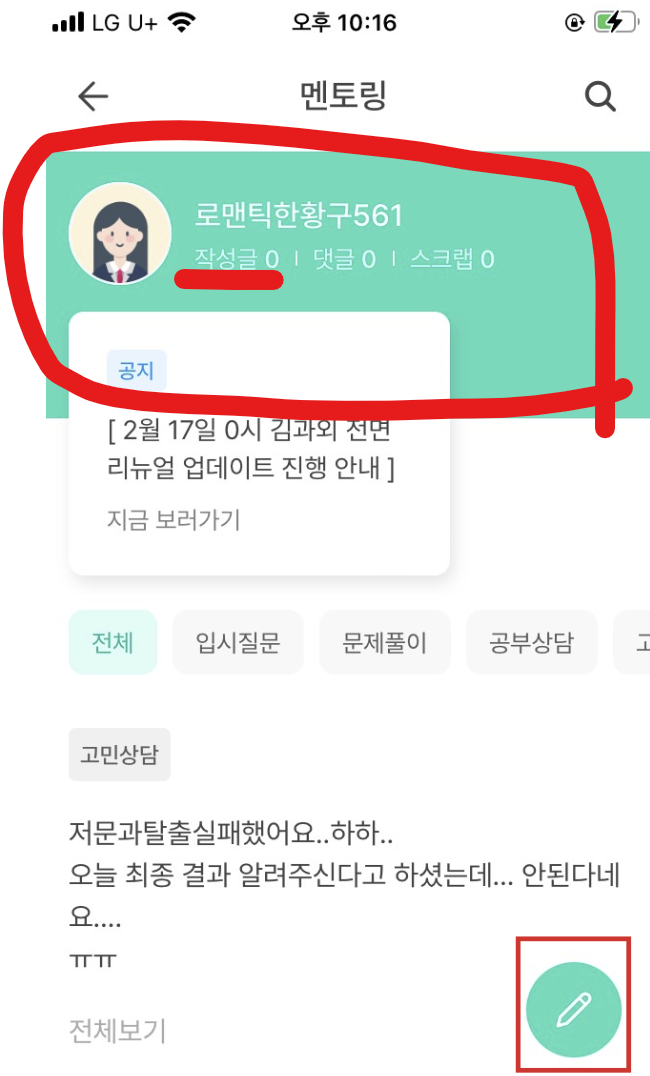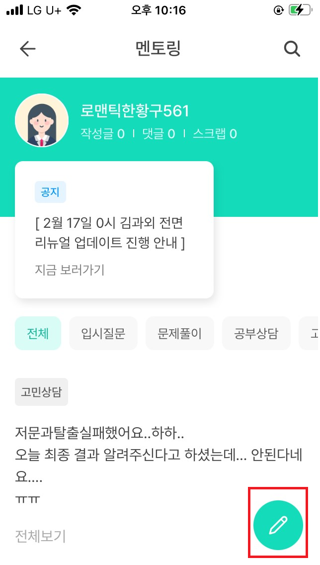 메인 화면 → 멘토링 → 펜 모양 버튼 클릭