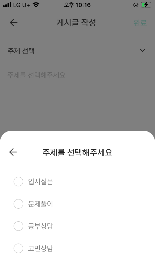 주제 선택 → 게시글 작성, 사진 업로드(선택)